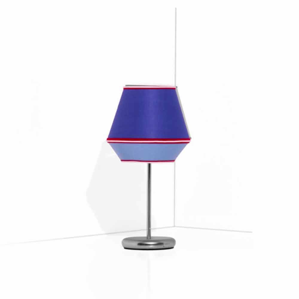 Wykonana w całości we Włoszech Lampa ta tabela składa się z chromowanego metalu podstawy, na której jest zainstalowany jasnoniebieski bawełna klosz wzbogacony białych i czerwonych płytek.