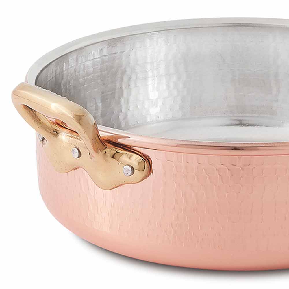 Niski rondel z ręcznie młotkowanej miedzi z mosiężnymi uchwytami, okrągły design 28 cm wyprodukowany we Włoszech.