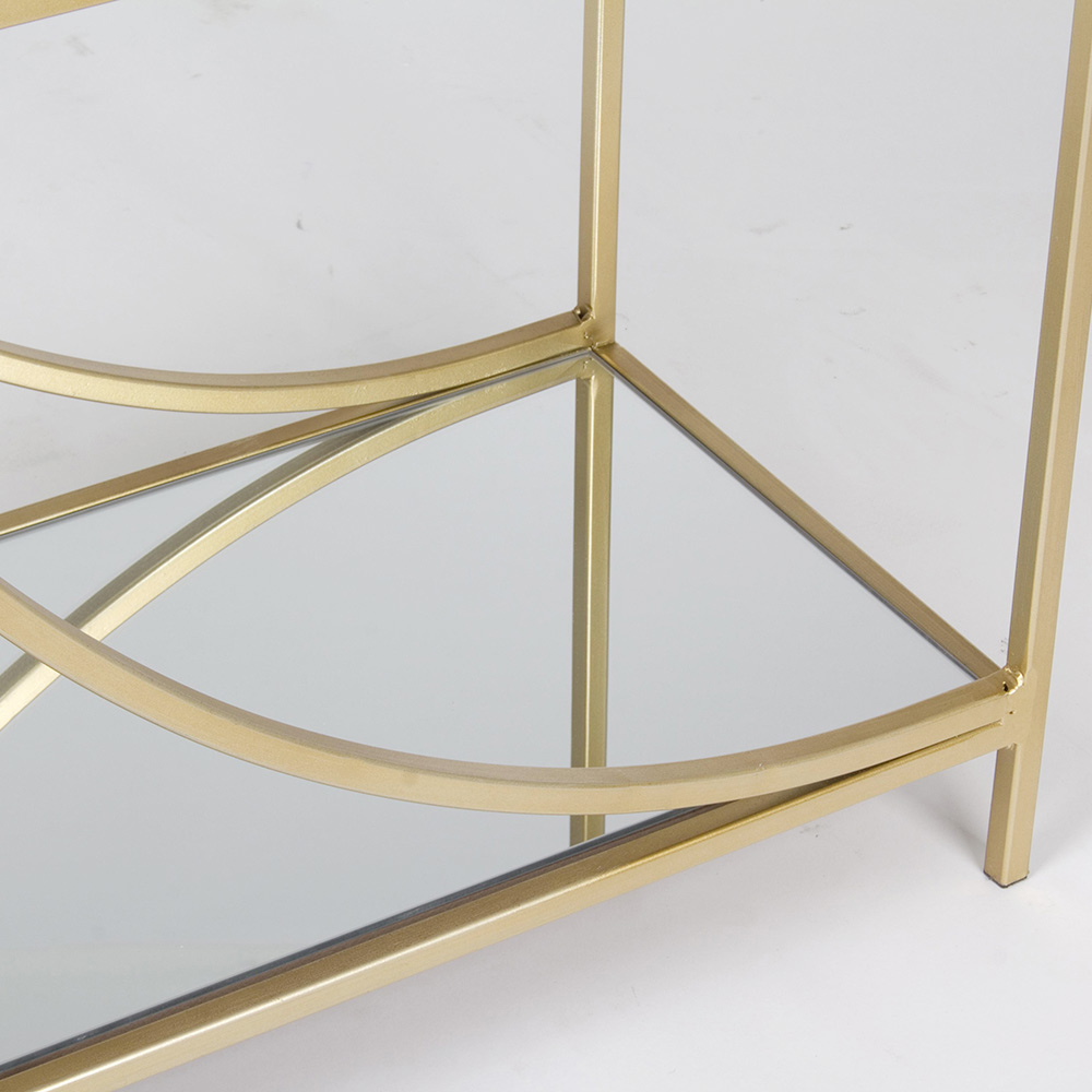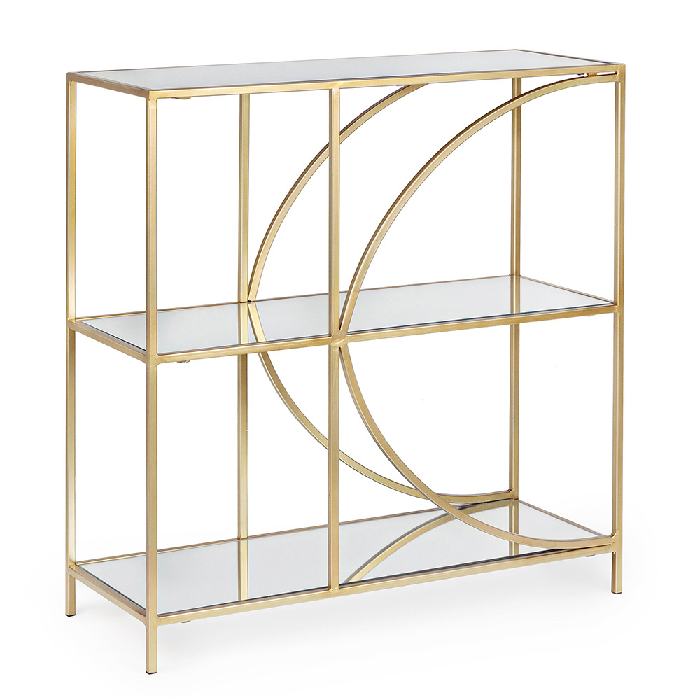 Niski regał ze stali wolnostojącej i 3 szklane półki o eleganckim wyglądzie.