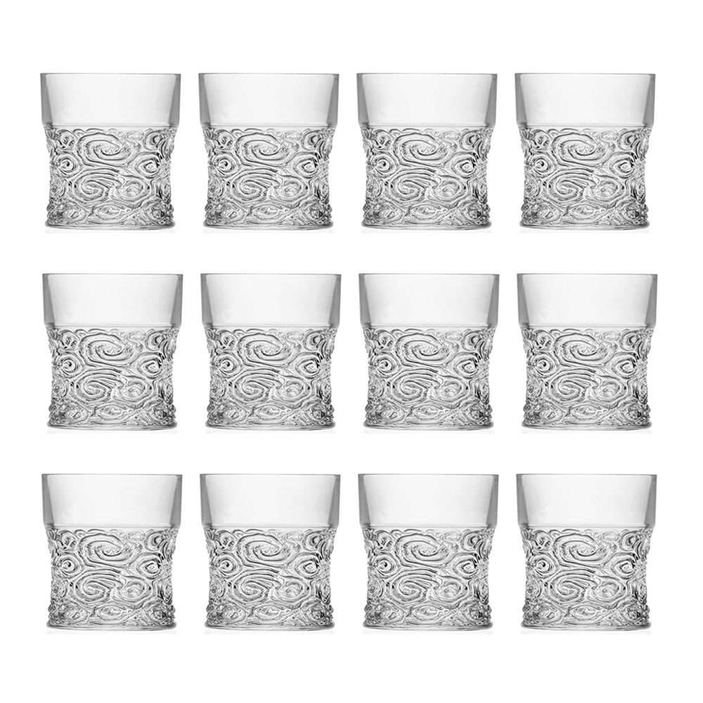 Podwójne kieliszki w starym stylu z eko kryształu z okrągłym zdobieniem 12 sztuk wyprodukowane we Włoszech.