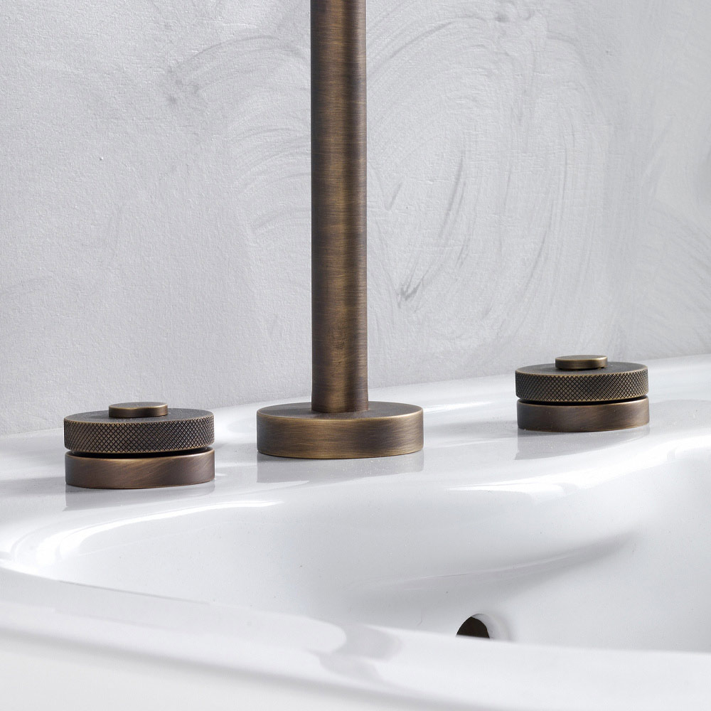Bateria umywalkowa 3-otworowa z odpływem w całości wykonana ręcznie przez doświadczonych rzemieślników w branży z ciężkiego mosiądzu, odlana w formach szanujących systemy rzemieślnicze z przeszłości i zabezpieczona grubą warstwą wykończenia dostępną w różnych kolorach.
