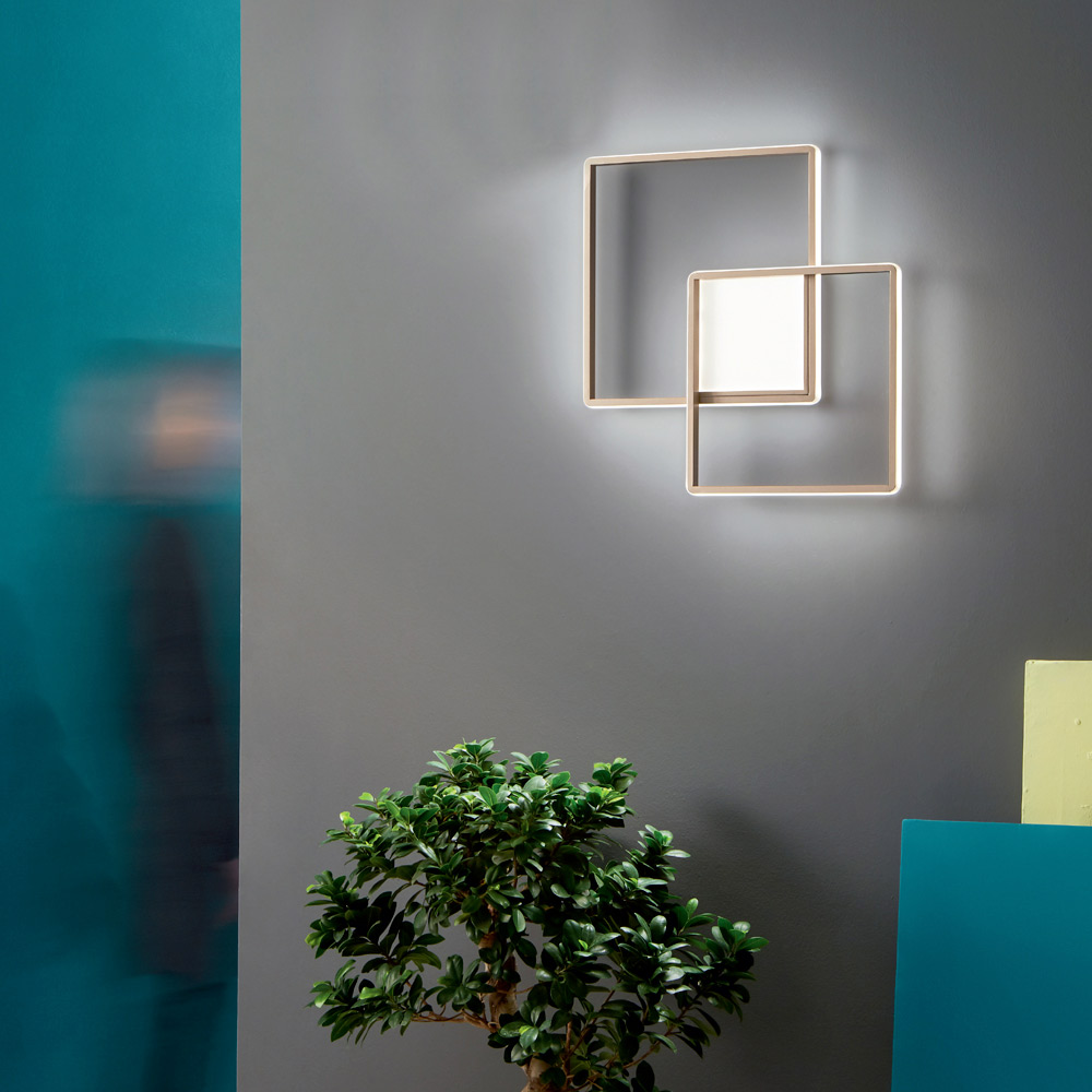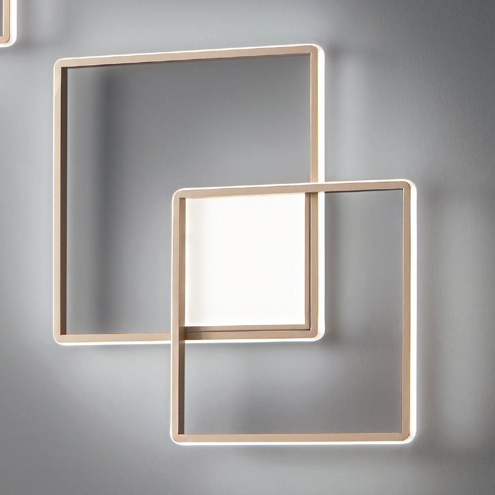 oryginalne i kwadratowe linie , pomyślane i zaprojektowane tak, aby w ekskluzywny i elegancki sposób oświetlać i wyposażać przestrzenie domowe, takie jak wejścia, korytarze, sypialnie, salony czy kuchnie. Wyrafinowane złote wykończenie podkreśla