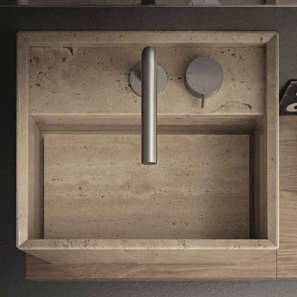 Umywalka nablatowa kamienna z wykończeniem trawertynowym pokrytym żywicą, z otworem na baterię, bez przelewu, bez odpływu.