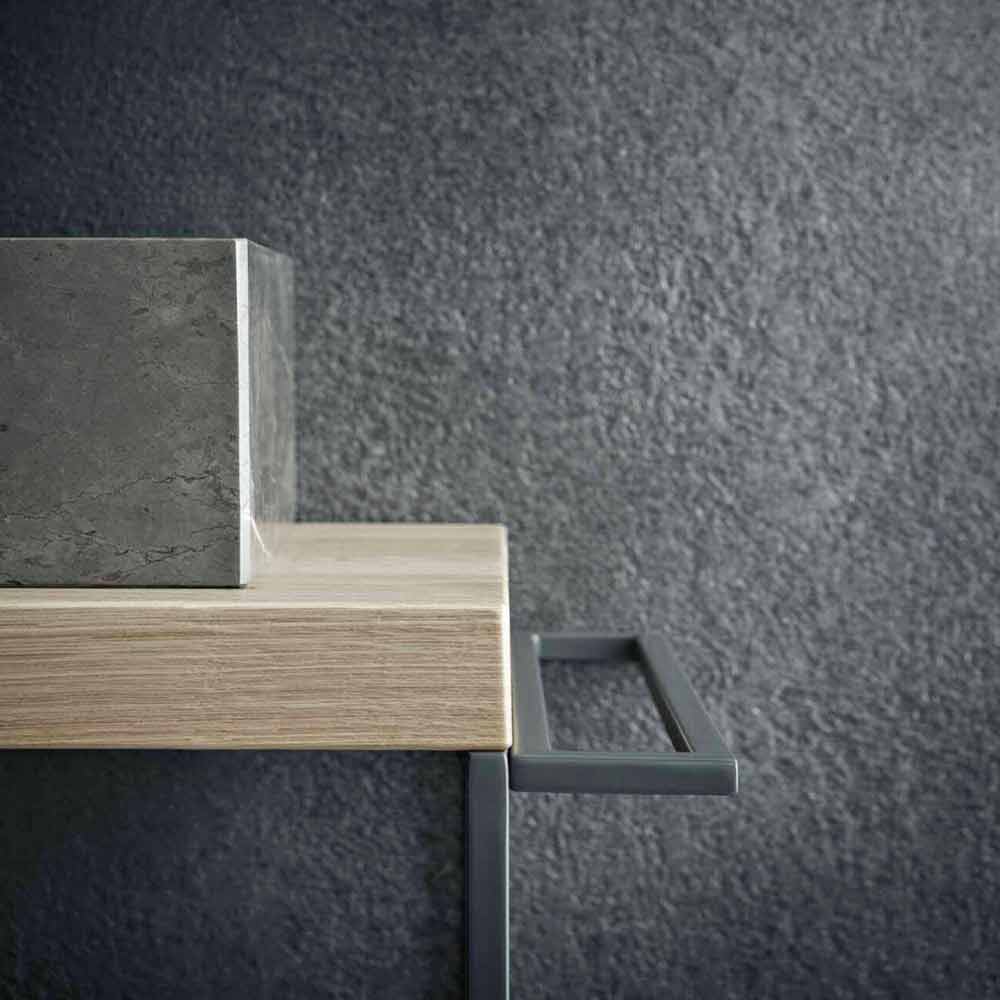 Kompozycja jest z naturalnego sękanego dębu , umywalki z szarego kamienia , metalowe konstrukcje w matowym ciemnoszarym lakierze. Szafka wisząca z matowego ciemnoszarego lakieru.