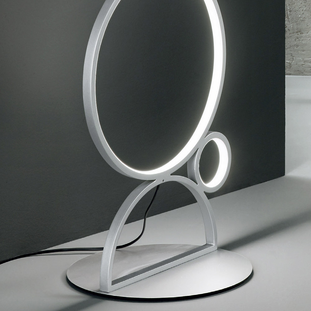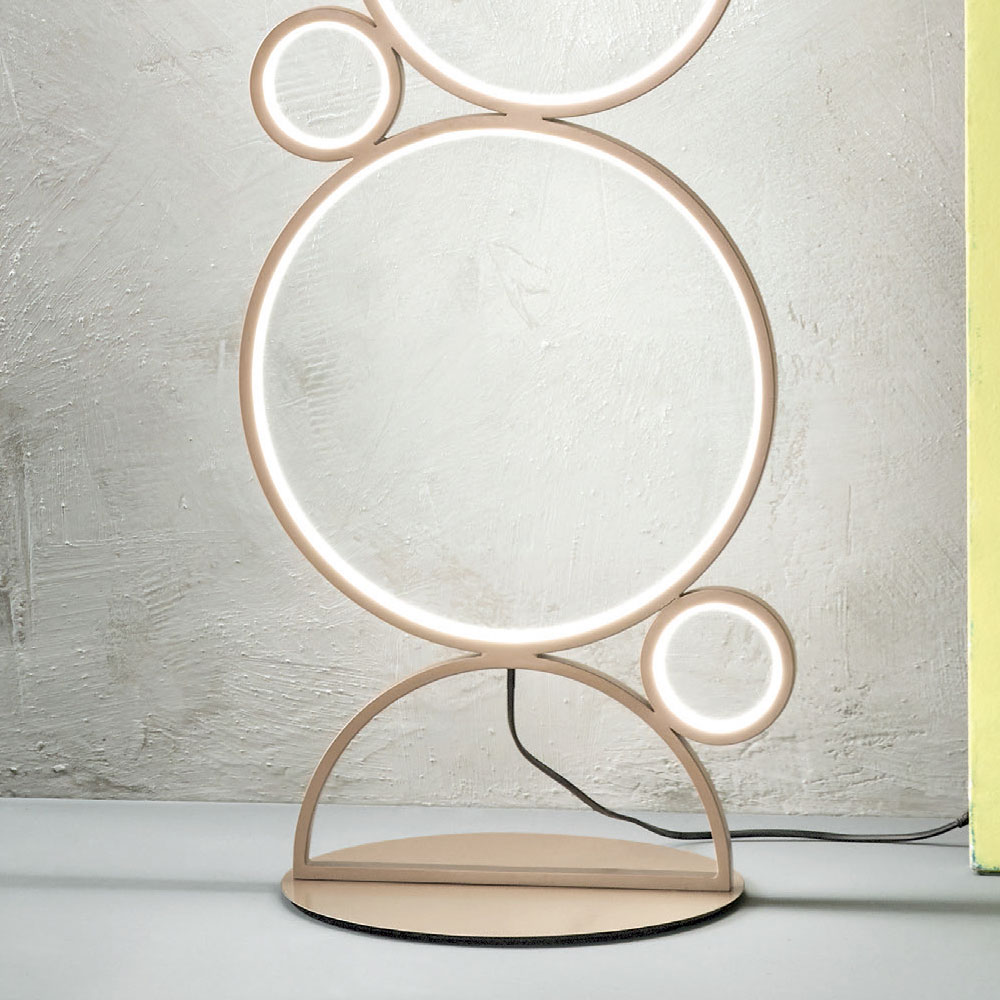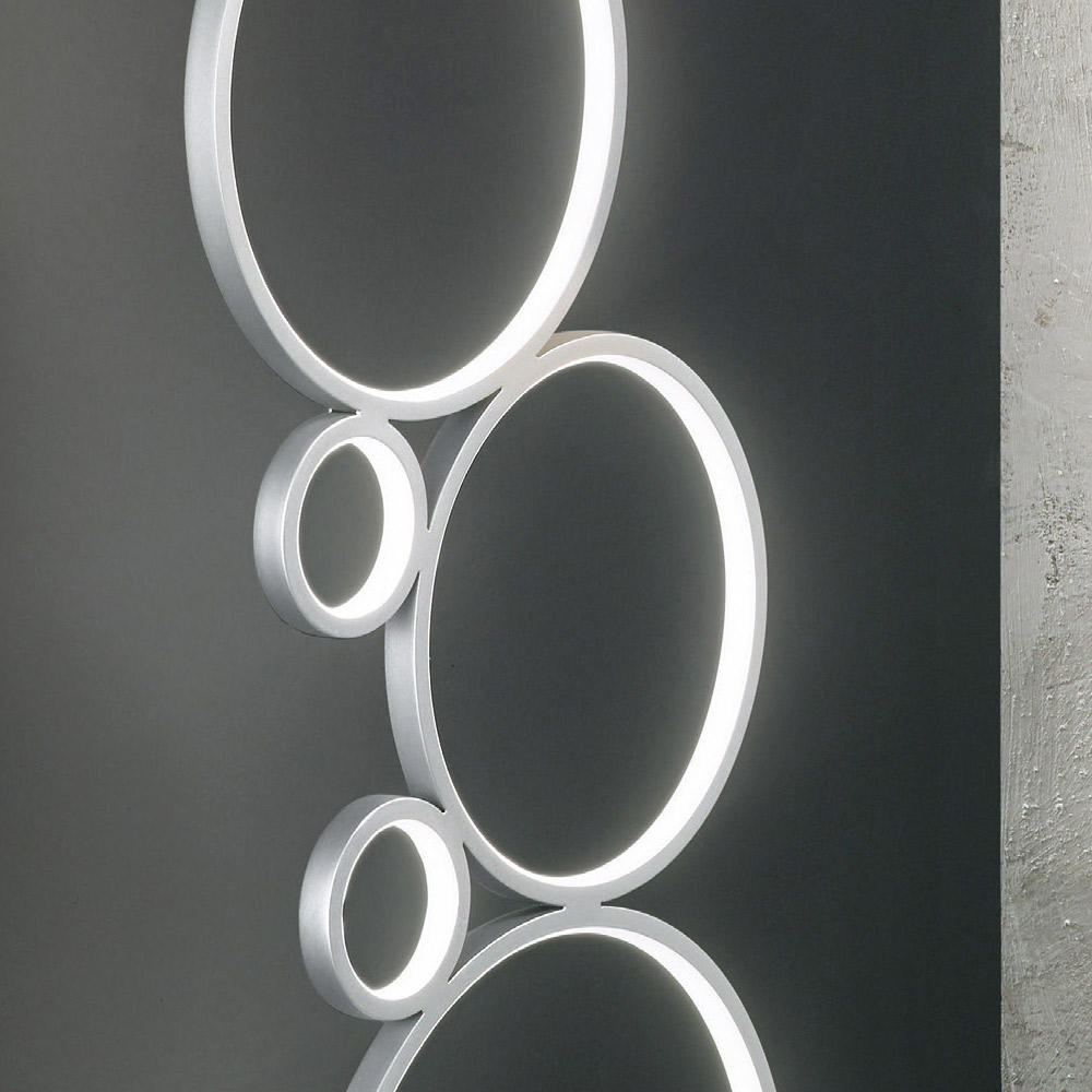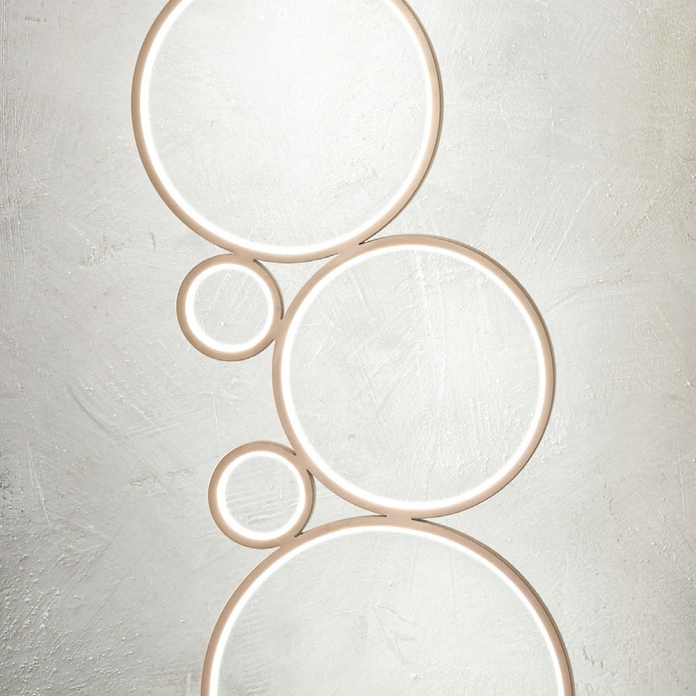 Uniwersalny element wyposażenia wnętrz, który można zamontować w każdym pomieszczeniu domowym: przedpokoju, kuchni, salonie i sypialni. Oryginalna kompozycja składająca się z okręgów o różnych rozmiarach, połączonych ze sobą i pokrytych z zewnątrz mlecznobiałym dyfuzorem, który otacza pasek LED, tworząc wspaniałe efekty świetlne na ścianach i