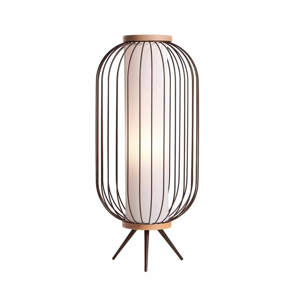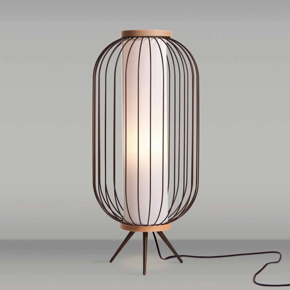 Lampa podłogowa wykonana z profilowanego pręta stalowego i pomalowana farbami epoksydowymi. Dwie opaski zamykające zaokrąglone ciało wykonane są z naturalnego drewna. Wersje podłogowe mogą być również używane jako puste kieszenie zarówno w wersji z kloszem, jak i bez. Źródło LED wersji z uchwytem jest wyposażone w akumulator o autonomii około 6 godzin.