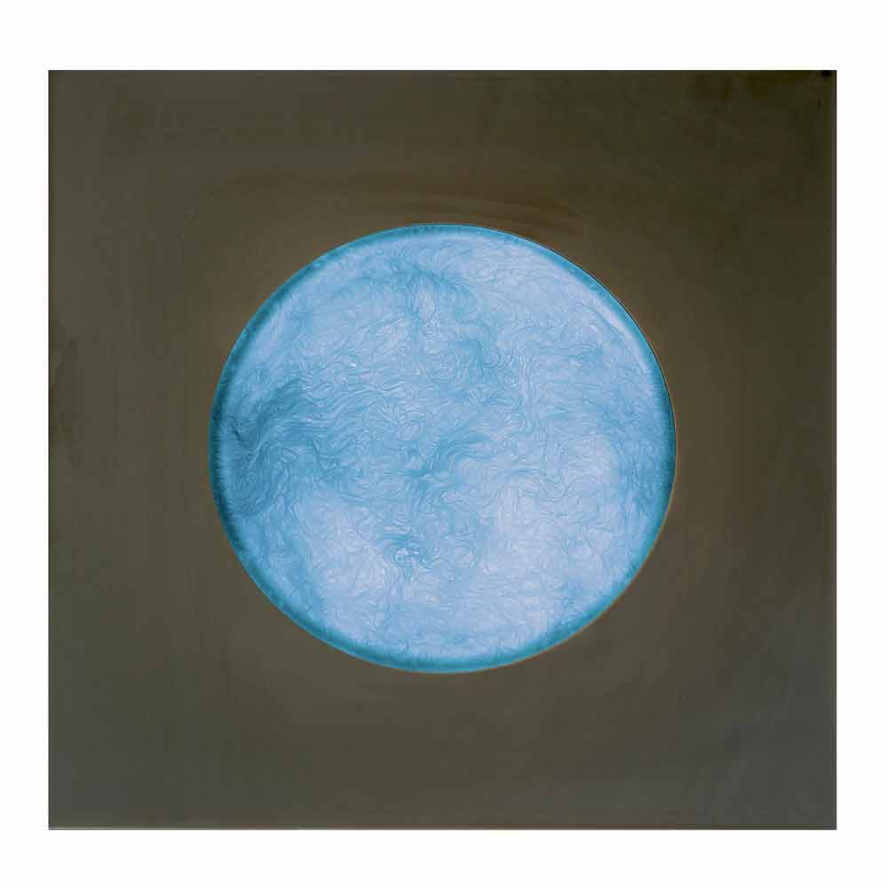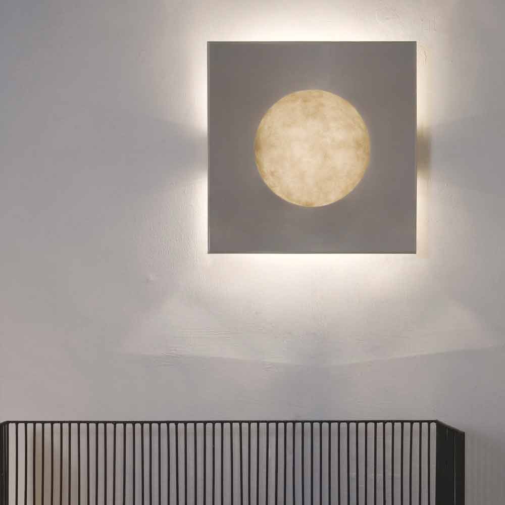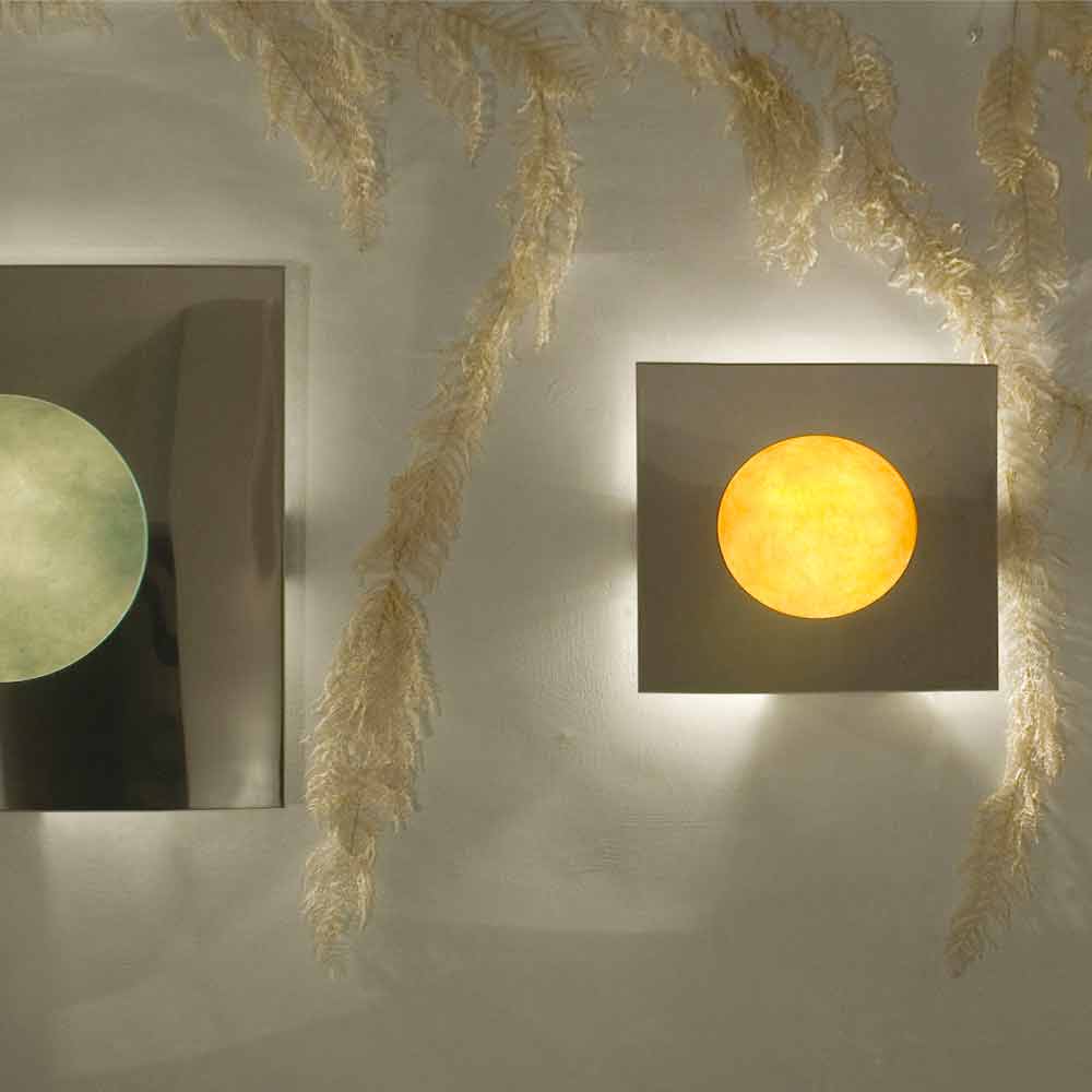 Prawdziwe dzieło sztuki, wykonane z polerowanej stali i nebulitu, materiału złożonego z żywicy i włókna, których żyły nadają lampie szczególny efekt księżycowy.