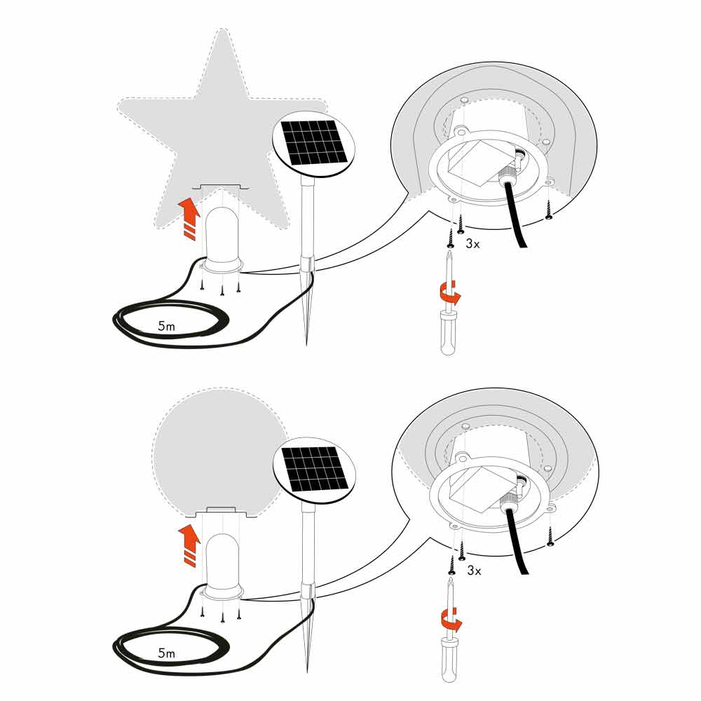 - nasadka słoneczna do użytku na zewnątrz : zawiera zainstalowany na stałe monochromatyczny system oświetlenia z białymi diodami LED z zewnętrznym modułem słonecznym ze zintegrowanym akumulatorem (1800 mA), który wychwytuje światło słoneczne w ciągu dnia, a następnie zamienia je w energię elektryczną. Do prawidłowego naładowania lampy potrzebna jest wystarczająca i odpowiednia ilość oświetlenia słonecznego, które włącza się niezależnie o zmierzchu za pomocą czujnika światła. Ten system nie wymaga gniazdek elektrycznych, chroniąc środowisko. Idealny do oświetlenia ścieżek, balkonów i tarasów. Czas trwania przy pełnym naładowaniu: około 6 godzin. Pobór mocy: 2 waty, temperatura: biała ciepła 3000K, czarny kabel 5m.