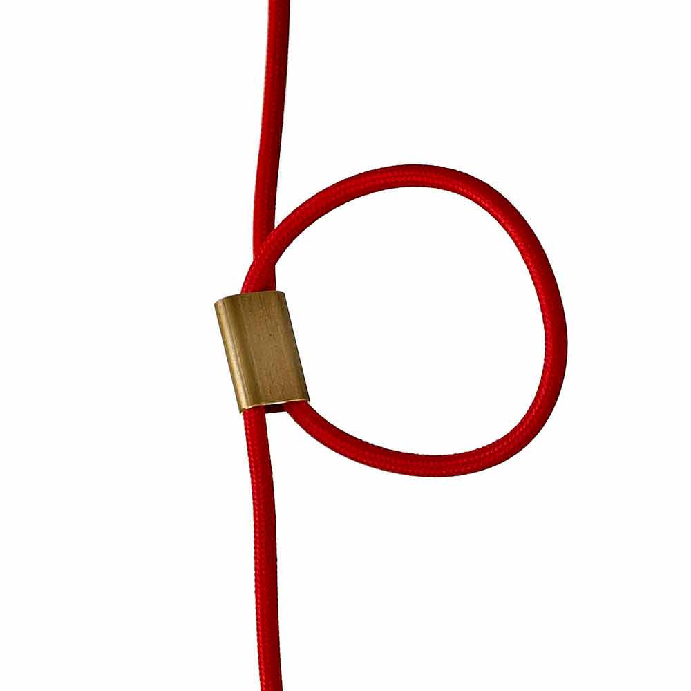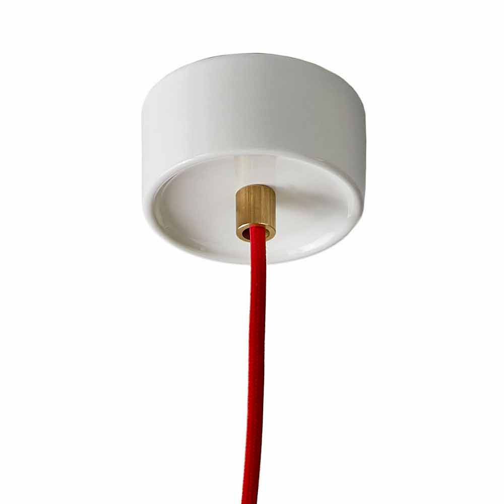 Kolorowa lampa wisząca z białej ceramiki i drewna bukowego z czerwoną linką i mosiężnym zaciskiem kablowym.