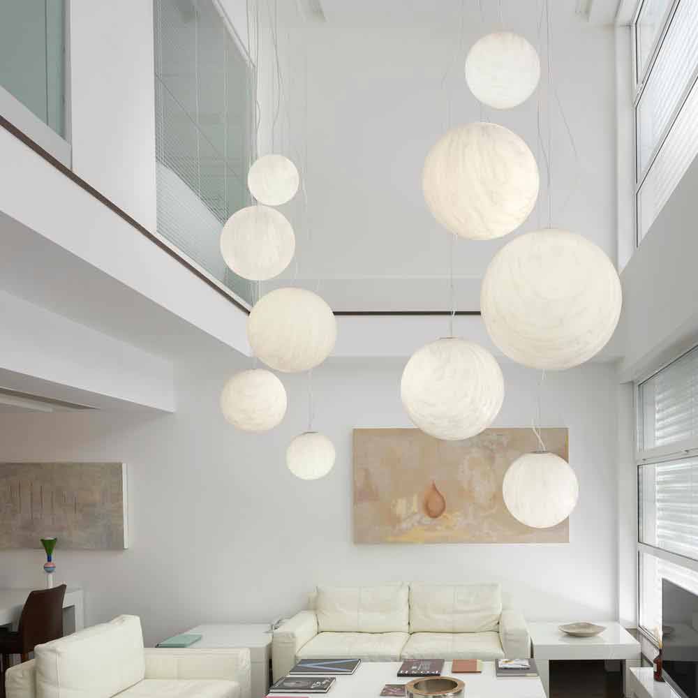 Może być używany zarówno jako pojedynczy żyrandol, jak i jako kompozycja kul o różnych rozmiarach, aby przekształcić go w duży modułowy punkt podparcia świetlnego z rozetą na pięć lamp Mineral, które mogą być sprzedawane osobno.