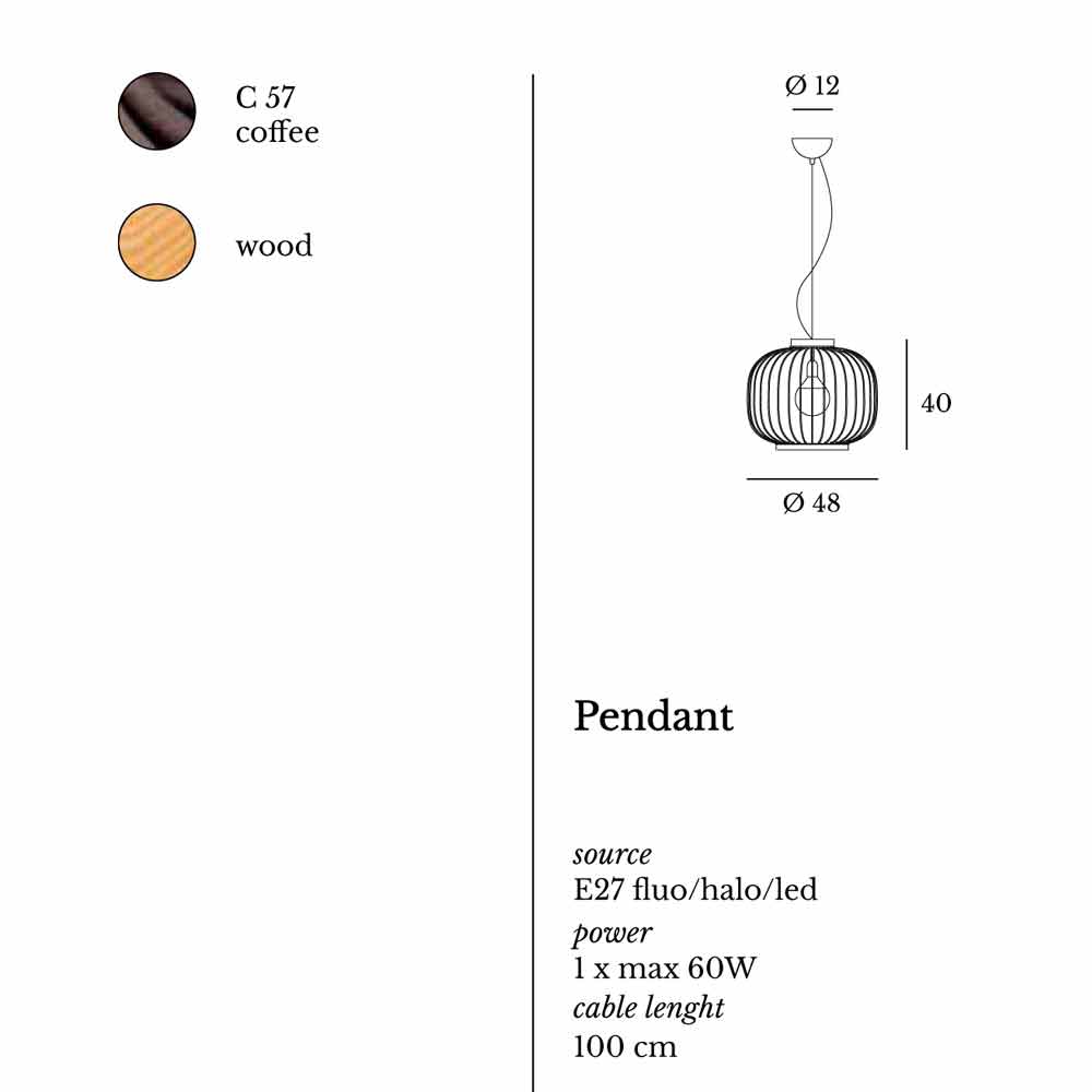 Lampa wisząca wykonana z profilowanego pręta stalowego i pomalowana farbami epoksydowymi. Dwie opaski zamykające zaokrąglone ciało wykonane są z naturalnego drewna.