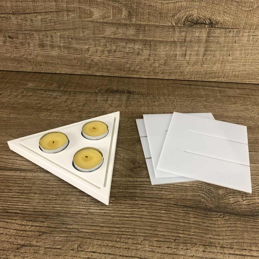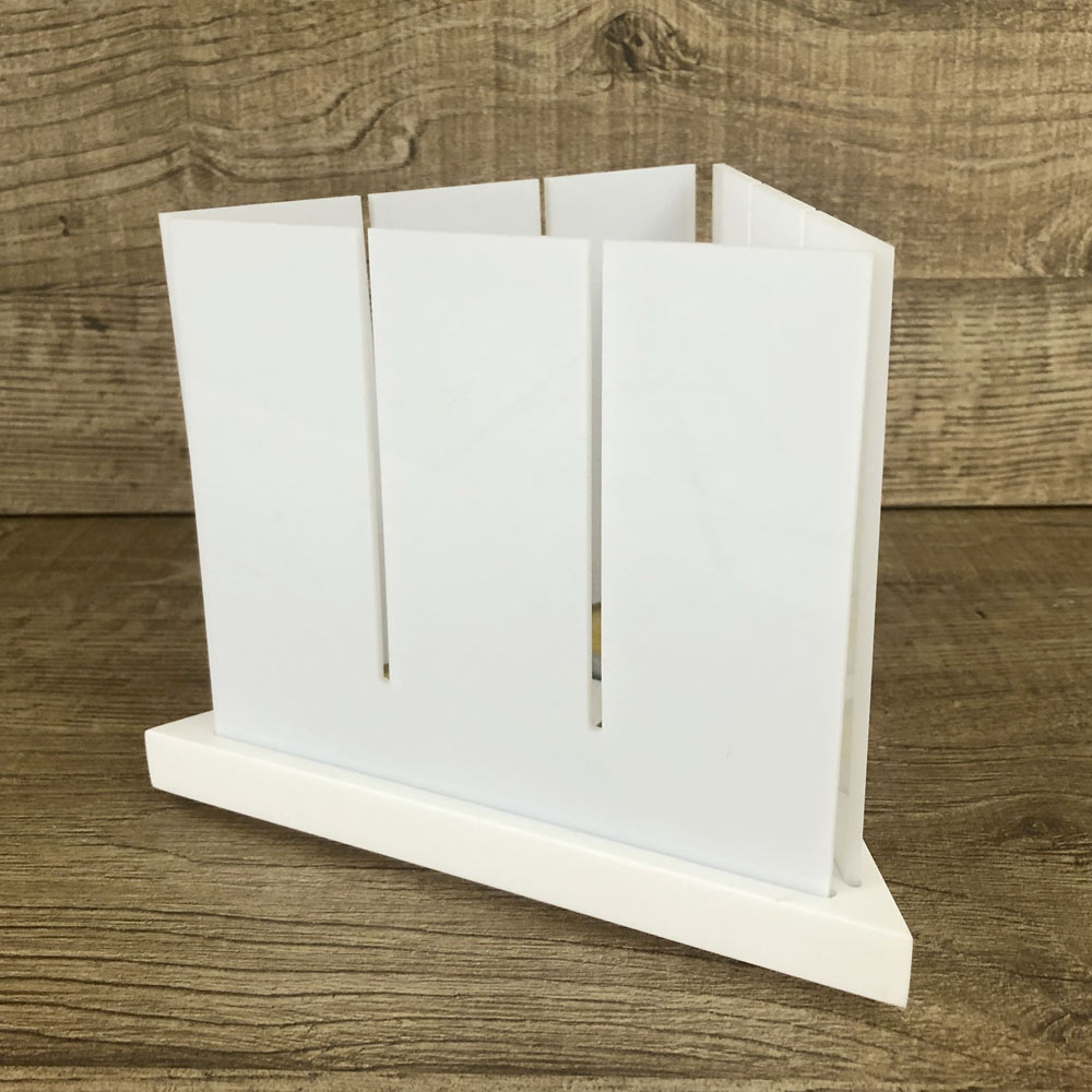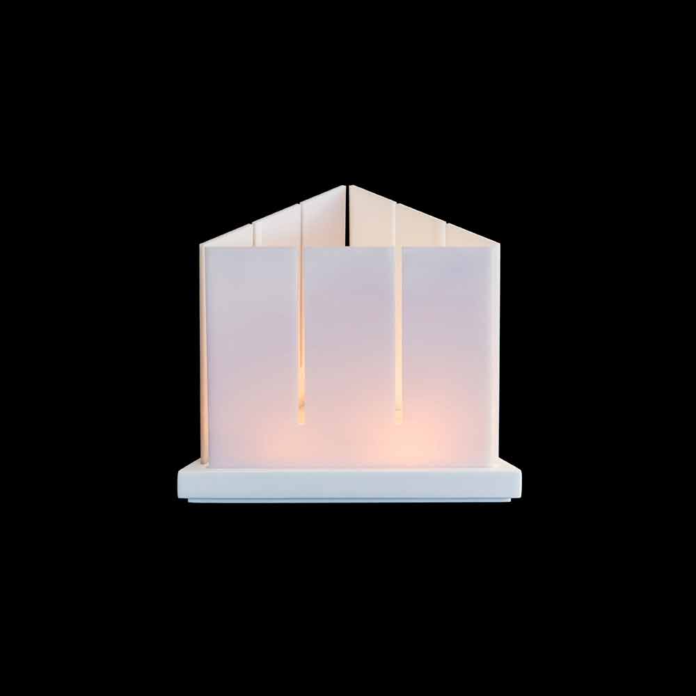Designerska latarnia w kształcie trójkąta z białego corianu wyprodukowana we Włoszech.