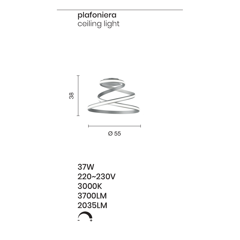 Lampa sufitowa z metalową konstrukcją lakierowaną na biało w komplecie ze źródłem światła LED . Dynamiczny i nowoczesny design, który potrafi odtworzyć wrażenie wirującej wstążki, wzbogacając w ten sposób wartość i estetykę produktu. To wrażenie ruchu staje się jego mocną stroną i pozwala podbić centrum uwagi w środowiskach domowych lub kontraktowych we współczesnym i awangardowym stylu. Nowoczesna technologia LED zapewnia również wysokiej jakości oświetlenie dopełniające lampę i czyniące ją optymalnym uzupełnieniem dla osób poszukujących funkcjonalności i designu w jednym produkcie.