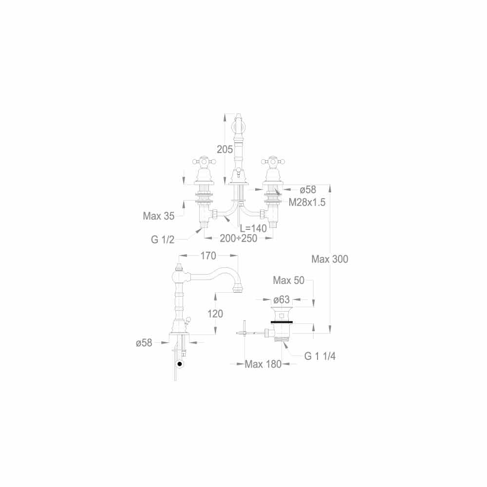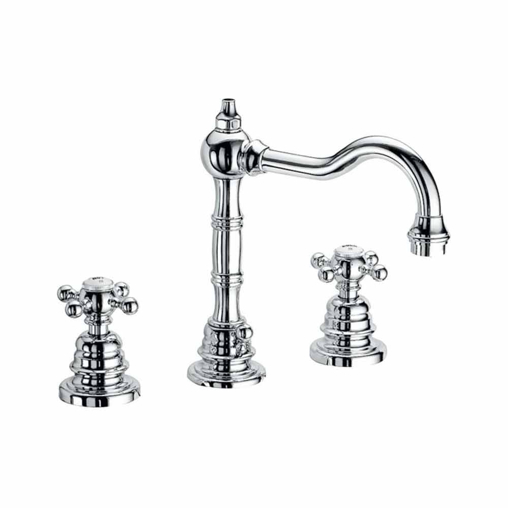 Klasyczna trzyotworowa bateria umywalkowa nablatowa z mosiądzu chromowanego o wysokości 205 mm i rozstawie środka 170 mm z odpływem i odpływem.