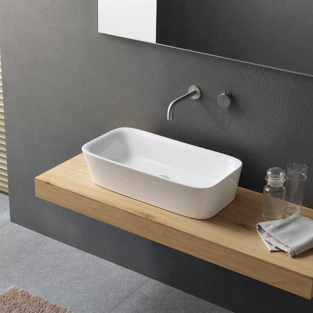 Umywalka nablatowa z białej ceramiki, nowoczesny prostokątny kształt z wysokimi i zaokrąglonymi krawędziami, wyprodukowana we Włoszech.
