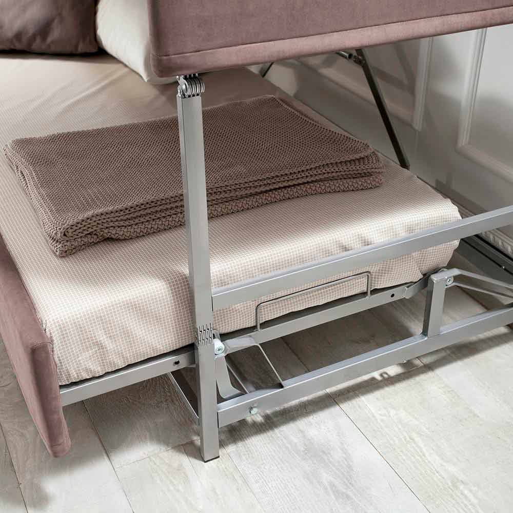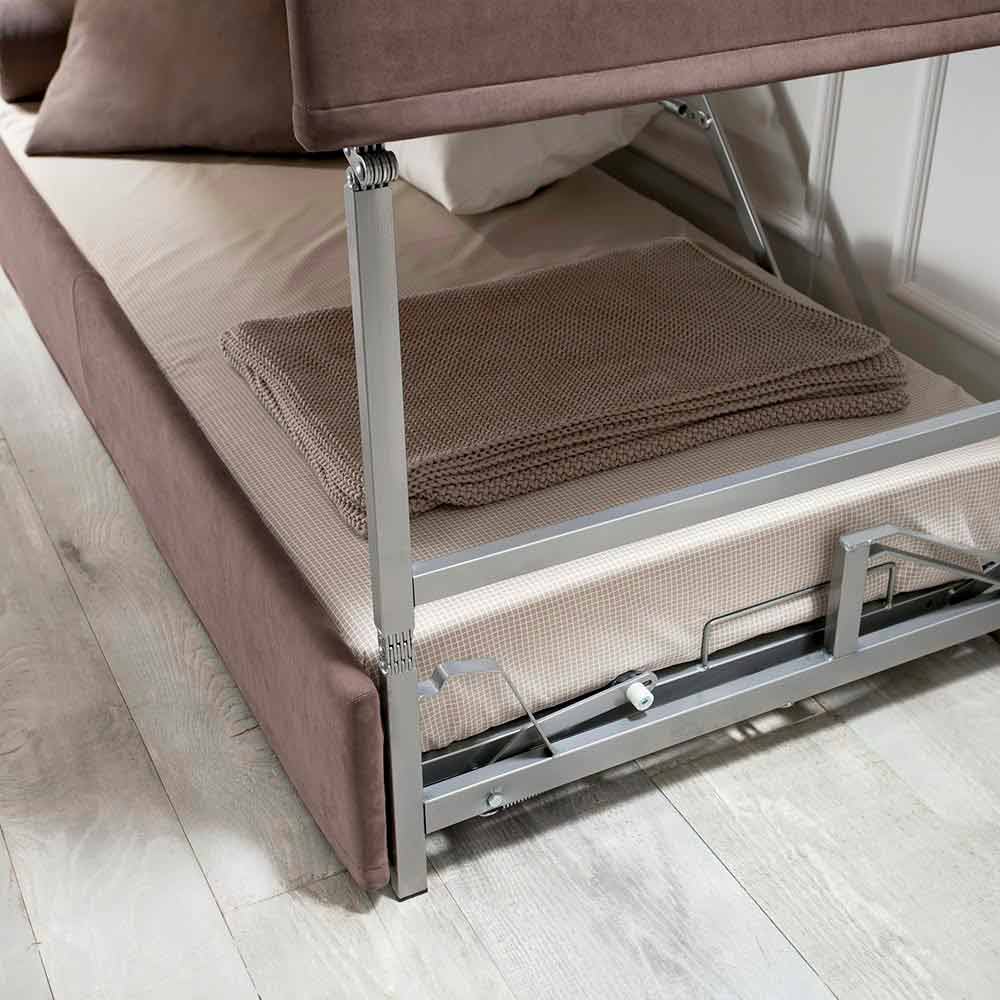 Rozkładana sofa piętrowa pokryta brązową tkaniną o nowoczesnym wzornictwie Made in Italy.