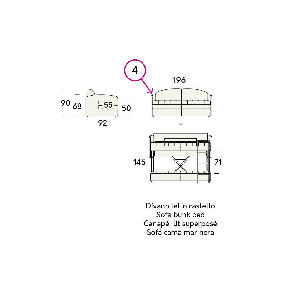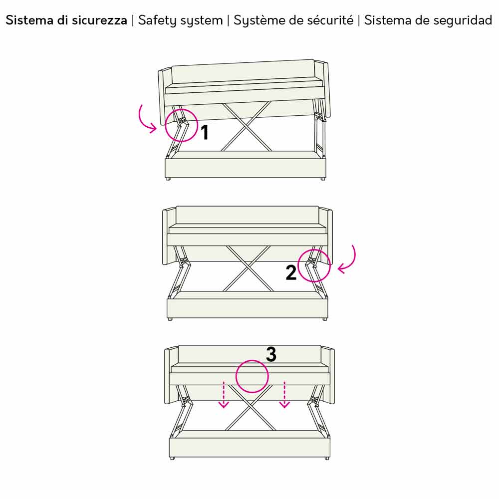 maksymalnego komfortu i spokoju dzięki systemowi otwierania z trzema urządzeniami zabezpieczającymi, które przekształcają łóżko w sofę i odwrotnie, a także siatce wystającej o 30 cm, która ułatwia i przyspiesza przygotowanie dolnego łóżka. Aby go ponownie zamknąć, wystarczy zwolnić dwie boczne podpory, które pozostaną zablokowane do momentu zwolnienia środkowego ogranicznika. Sofa jest również wyposażona w praktyczną drabinkę i barierkę boczną dla jeszcze większej gwarancji bezpieczeństwa.