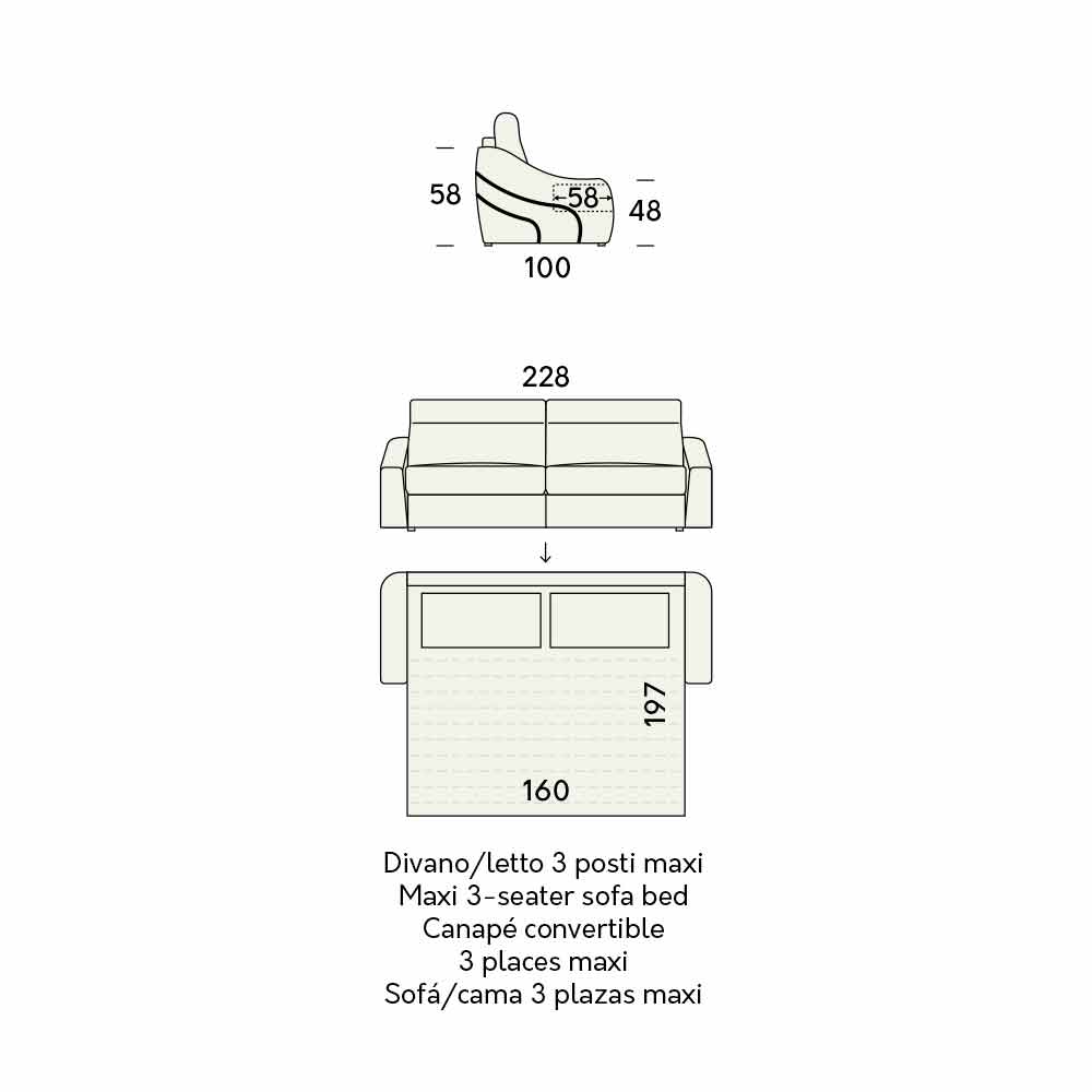 - Dł. 228 x gł. 100 x wys. 104 cm (materac: dł. 160 x gł. 197 x wys. 14 cm).