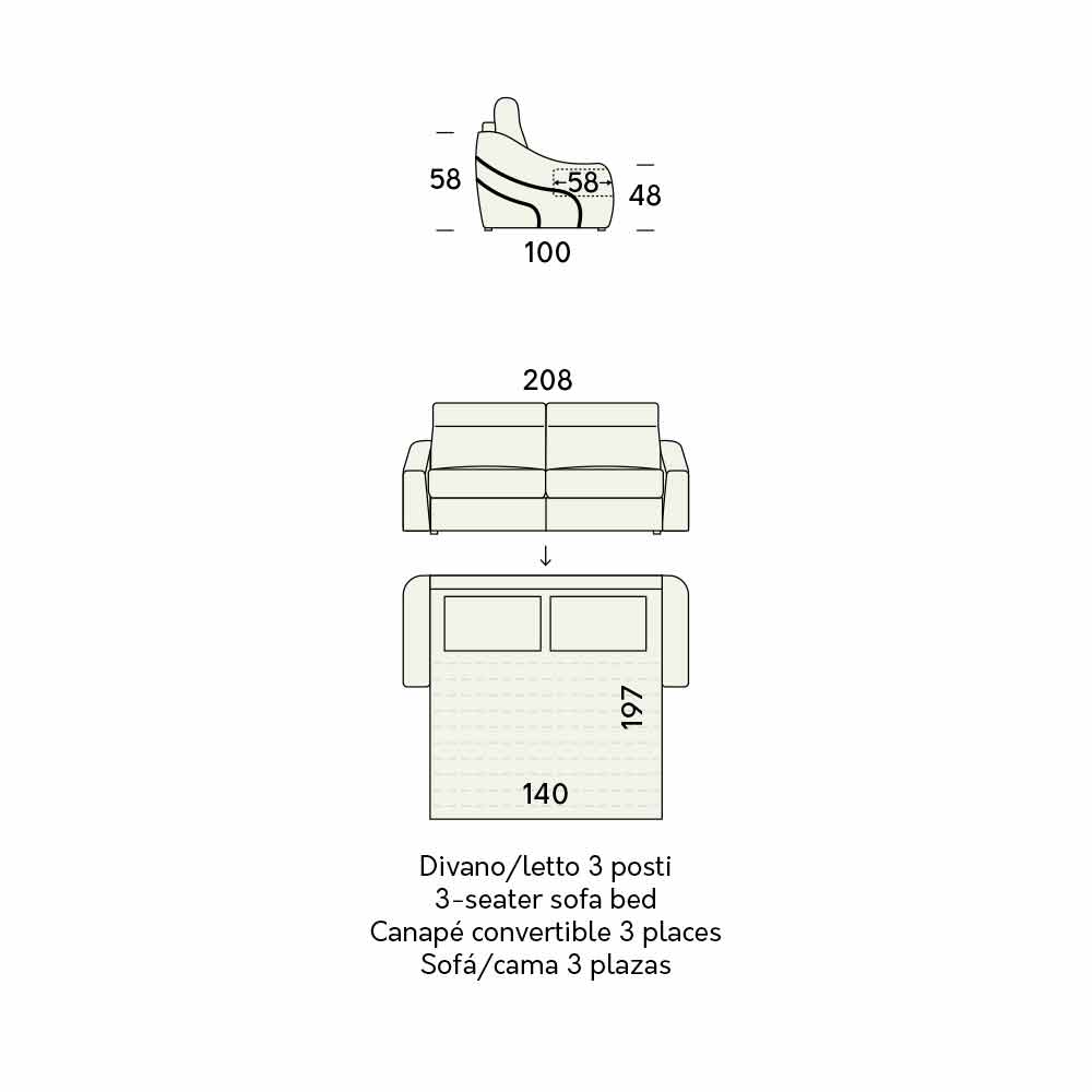 - Dł. 208 x szer. 100 x wys. 104 cm (materac: dł. 140 x gł. 197 x wys. 14 cm);