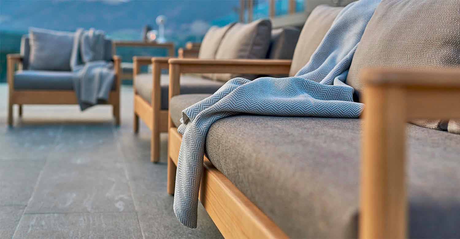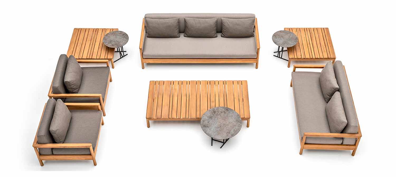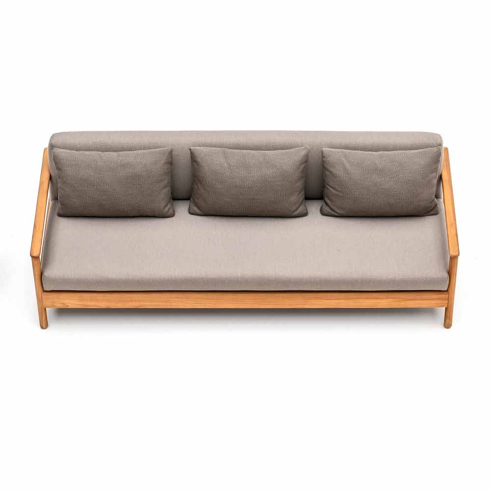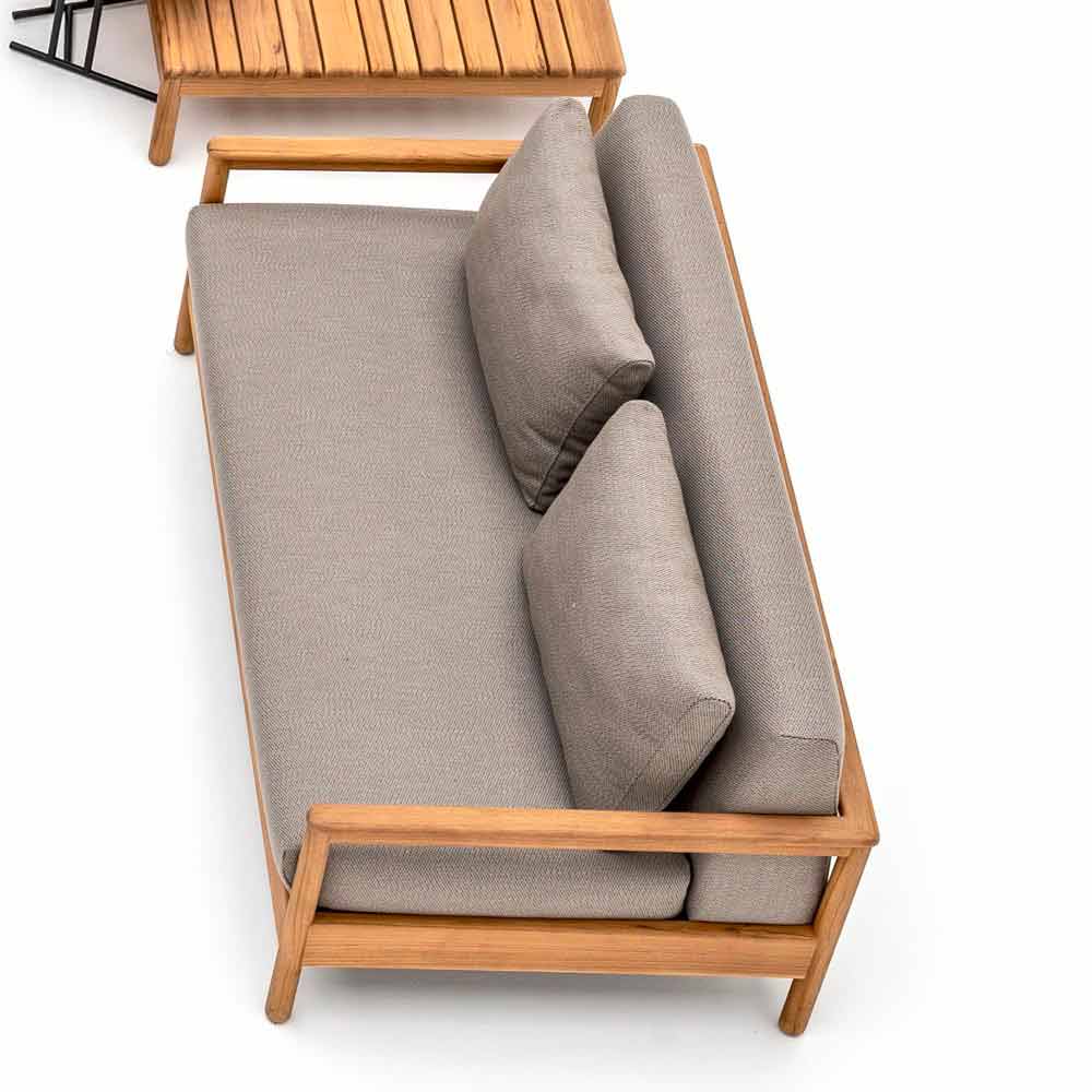 Bali to wspaniała kanapa ogrodowa, charakteryzująca się widoczną konstrukcją nośną z litego certyfikatu plantacji drewna tekowego oraz siedzeniami i podwójnymi oparciami pokrytymi tkaniną i wyściełanymi gumami Dryfeel.