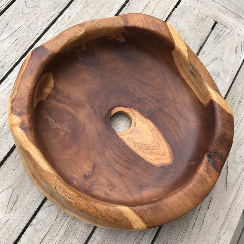 Naturalny i polerowany teak w zasadniczym i praktycznym kształcie. Surowe drewno przywraca zapachy i kolory lasów tropikalnych. Umywalka nablatowa z gładkiego i nieprzetworzonego naturalnego drewna tekowego.