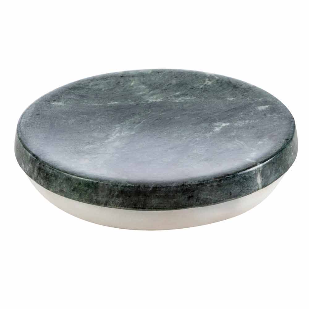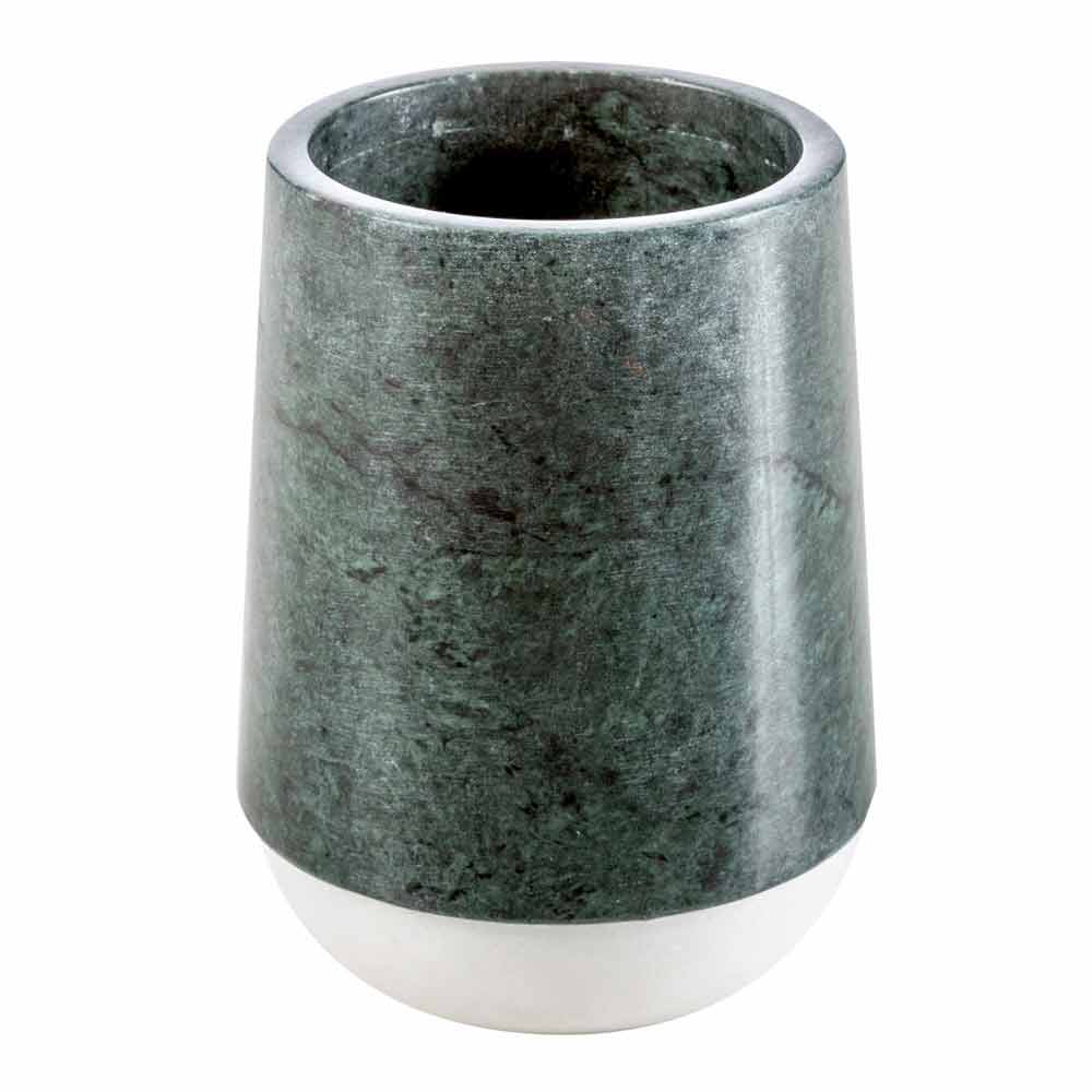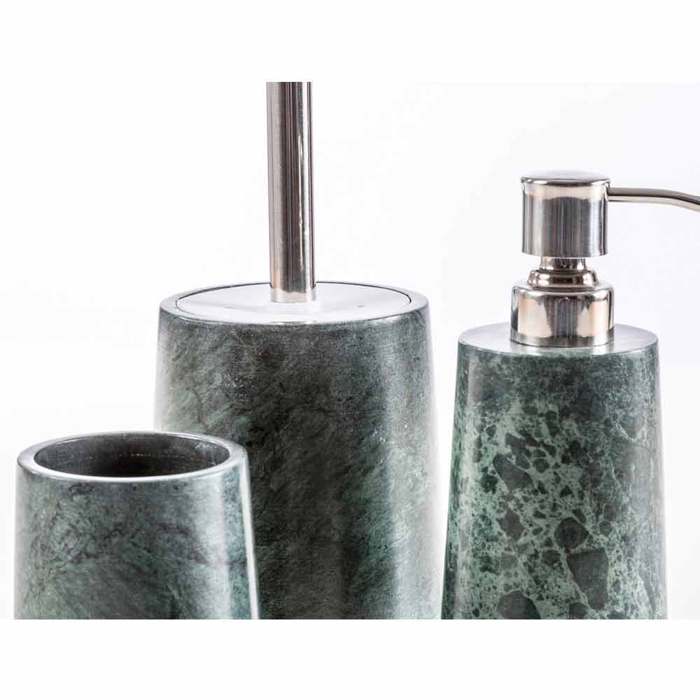 Bombei to zestaw akcesoriów łazienkowych z nakrapianego zielonego marmuru bogatego w żyły, który spoczywa na marmurowej podstawie Calacatta.