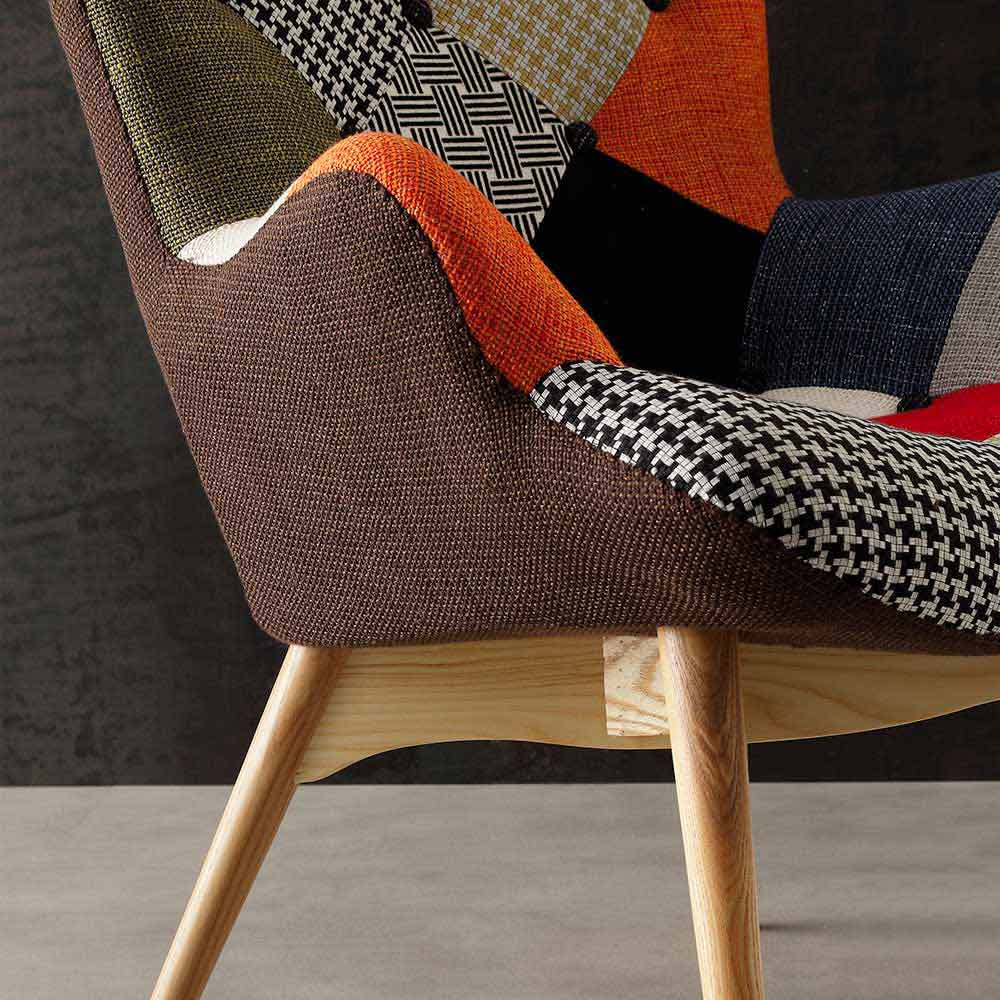 Wielobarwne patchworkowe fotele Veronica, nogi z litego drewna. Nowoczesny fotel. Veronica ma drewniane nogi z drewna jesionowego, naturalne wykończenie i wielokolorową patchworkową powłokę.