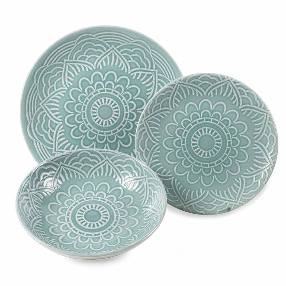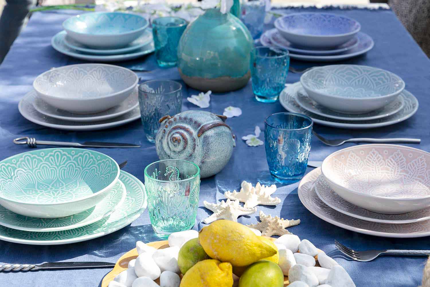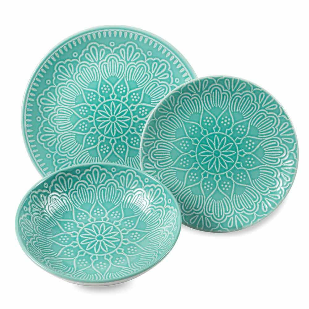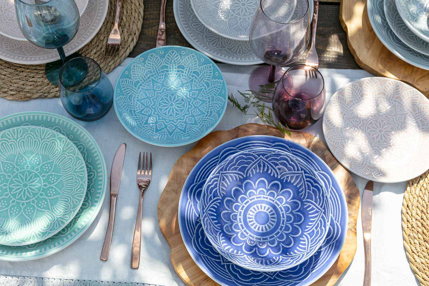 Zestaw kolorowych i nowoczesnych naczyń kamionkowych wraz z 18-częściową zastawą stołową.