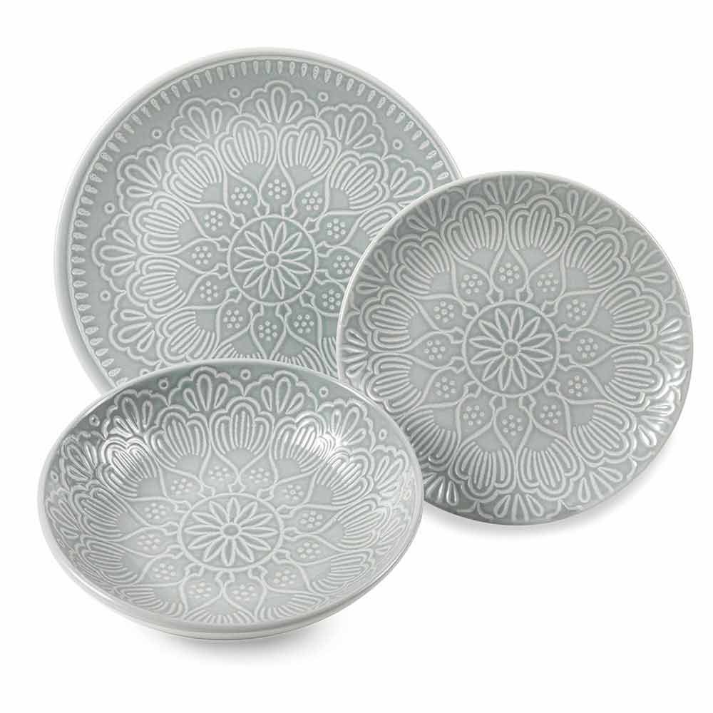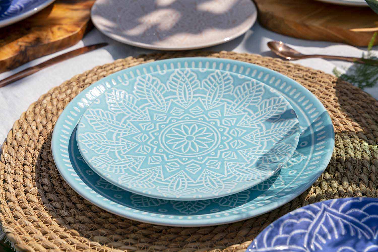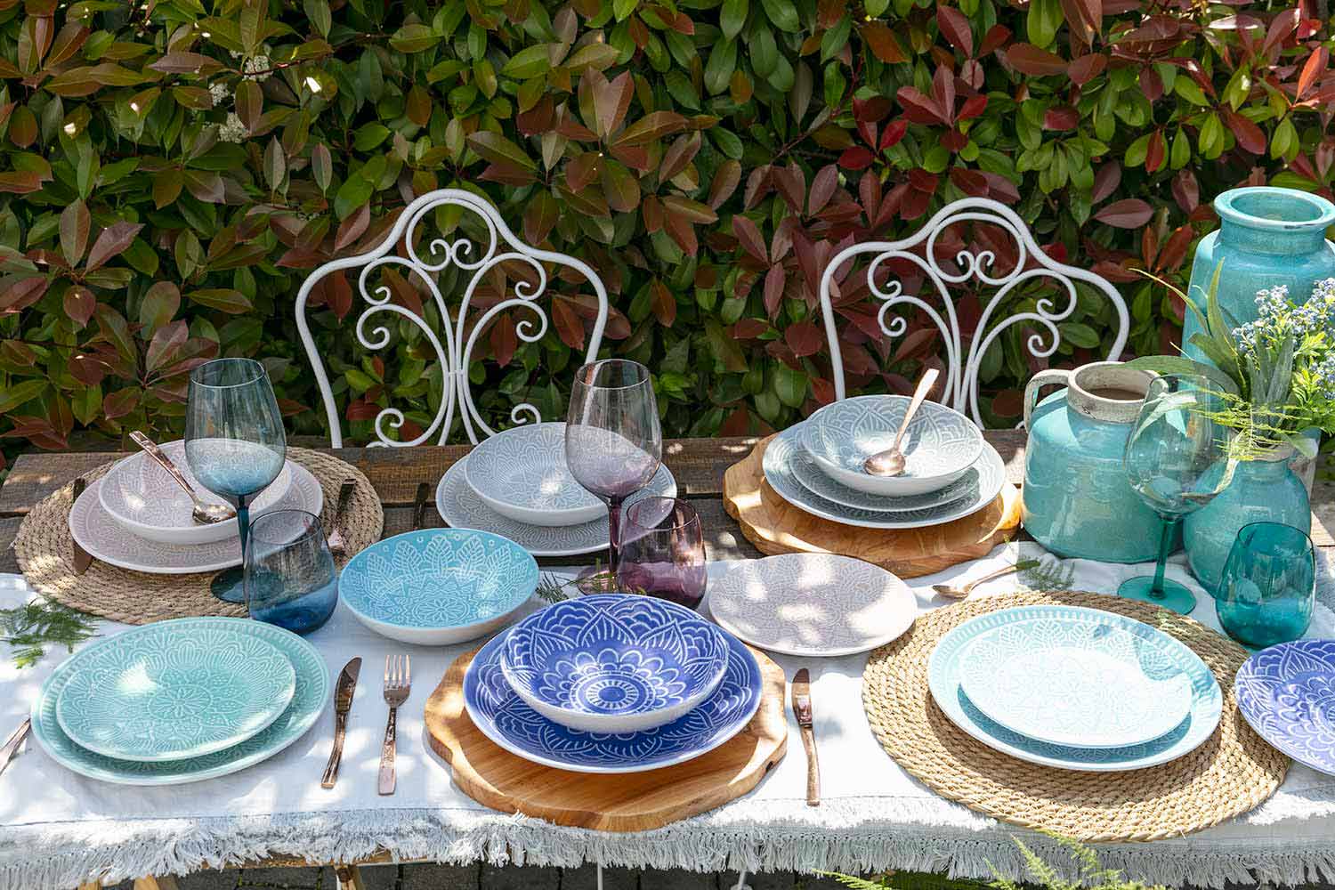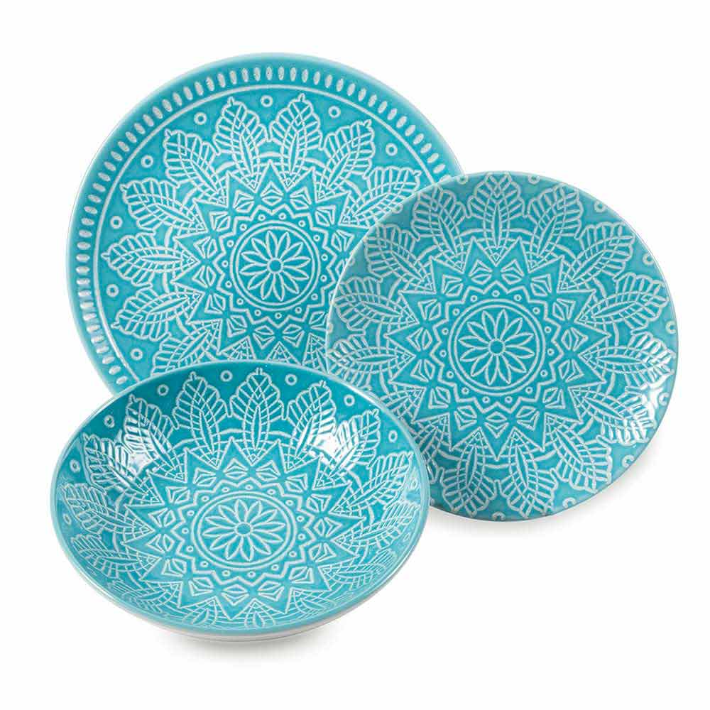 Zestaw kolorowych i nowoczesnych naczyń kamionkowych wraz z 18-częściową zastawą stołową.