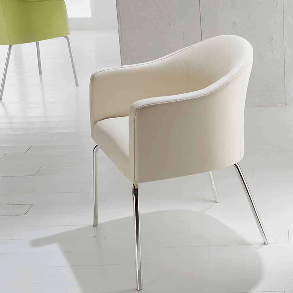 ma chromowaną metalową ramę i siedzisko ze sztucznej skóry, dostępne w różnych odcieniach kolorystycznych.