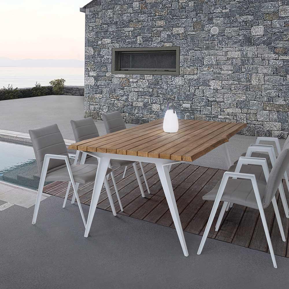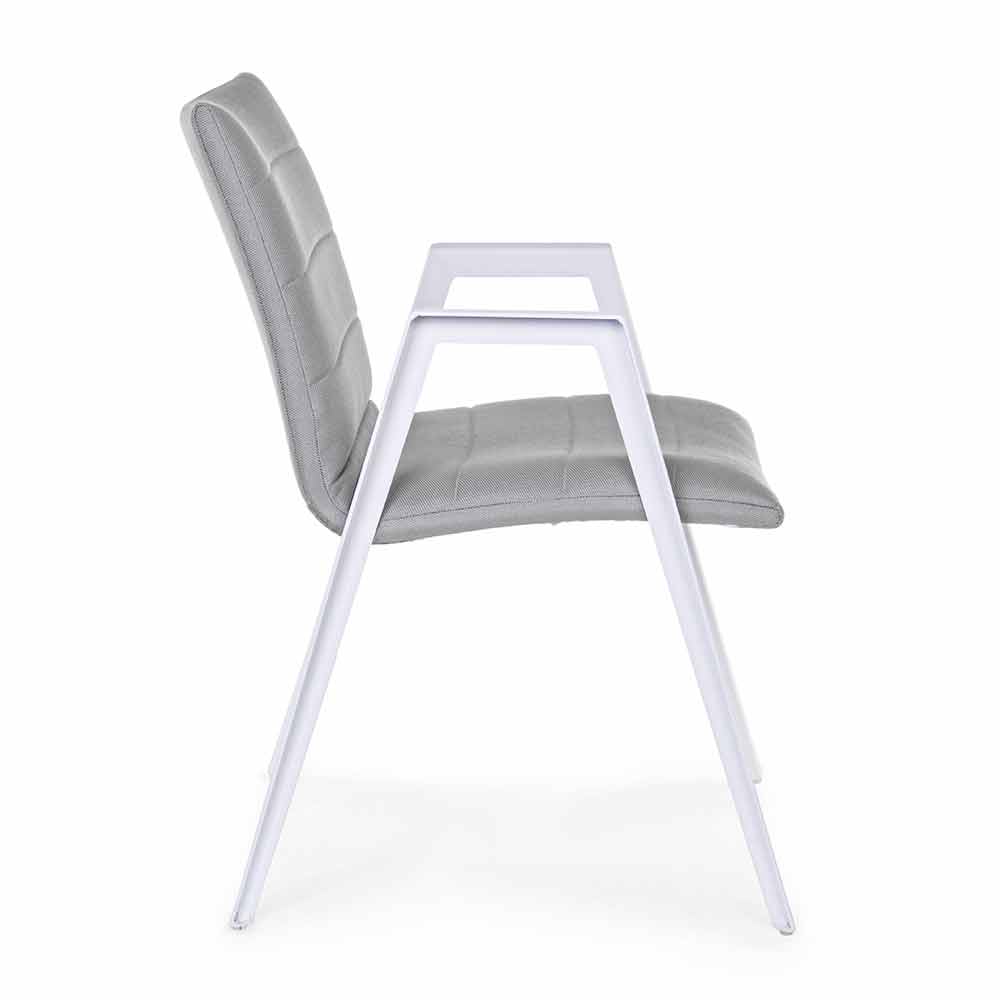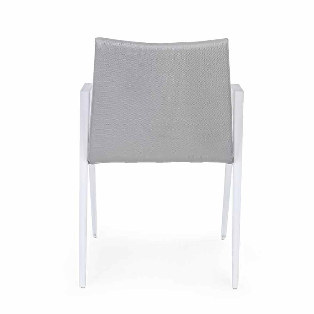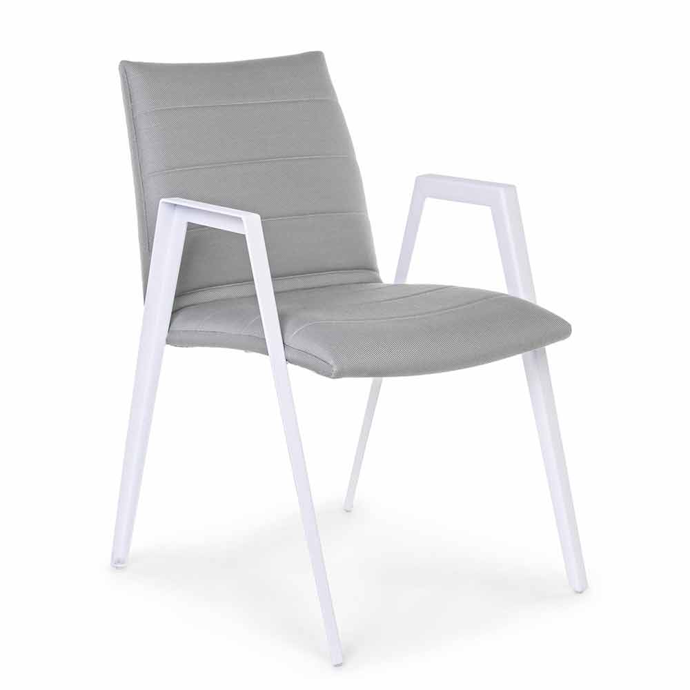 Nowoczesne krzesło ogrodowe z podłokietnikami, nogami z białego aluminium i siedziskiem i oparciem z szarej tkaniny.