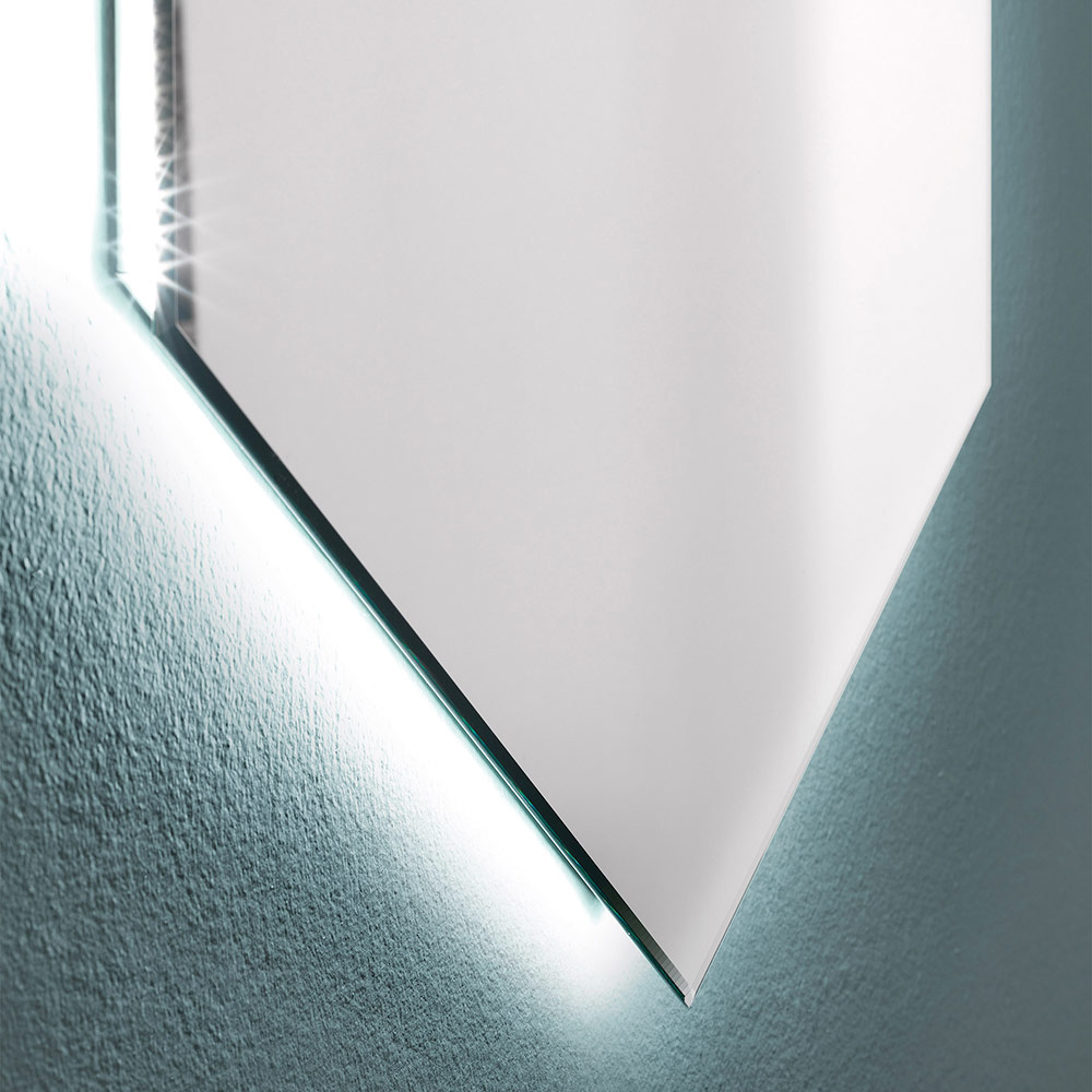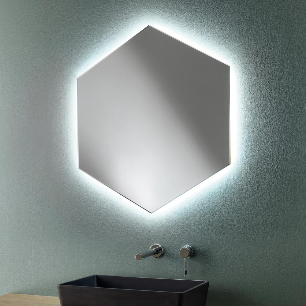 Nowoczesne, ścienne lustro łazienkowe w kształcie sześciokąta ze ściętymi krawędziami i podświetleniem LED, wyprodukowane we Włoszech.