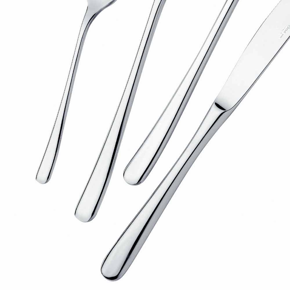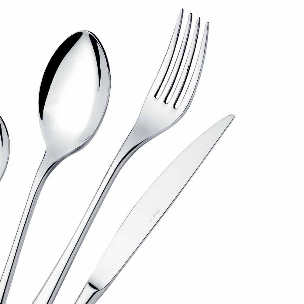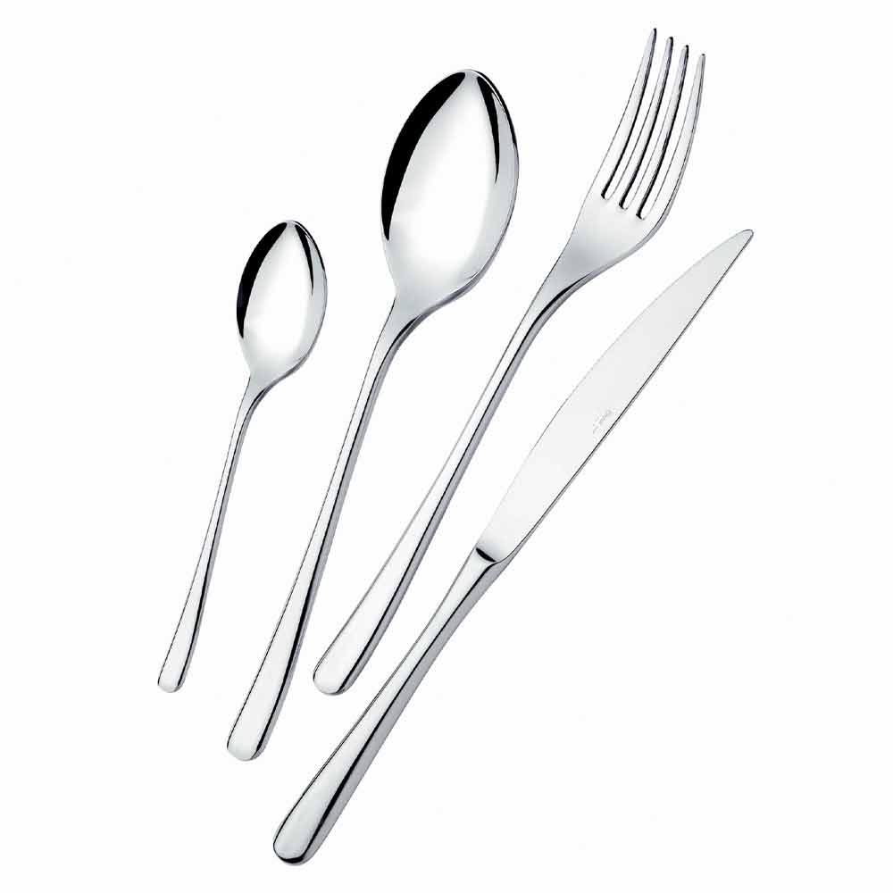 24 sztućce ze stali nierdzewnej o nowoczesnym designie z błyszczącym wykończeniem, wyprodukowane we Włoszech.