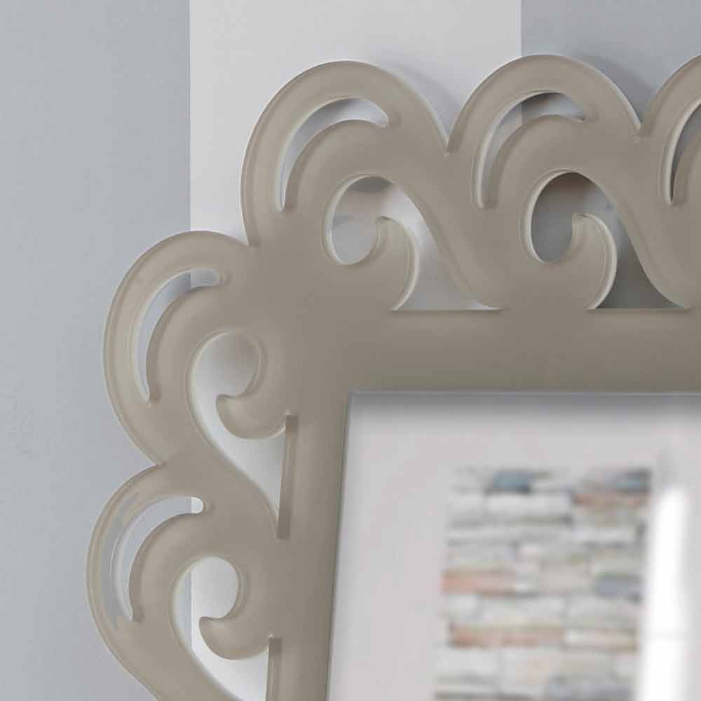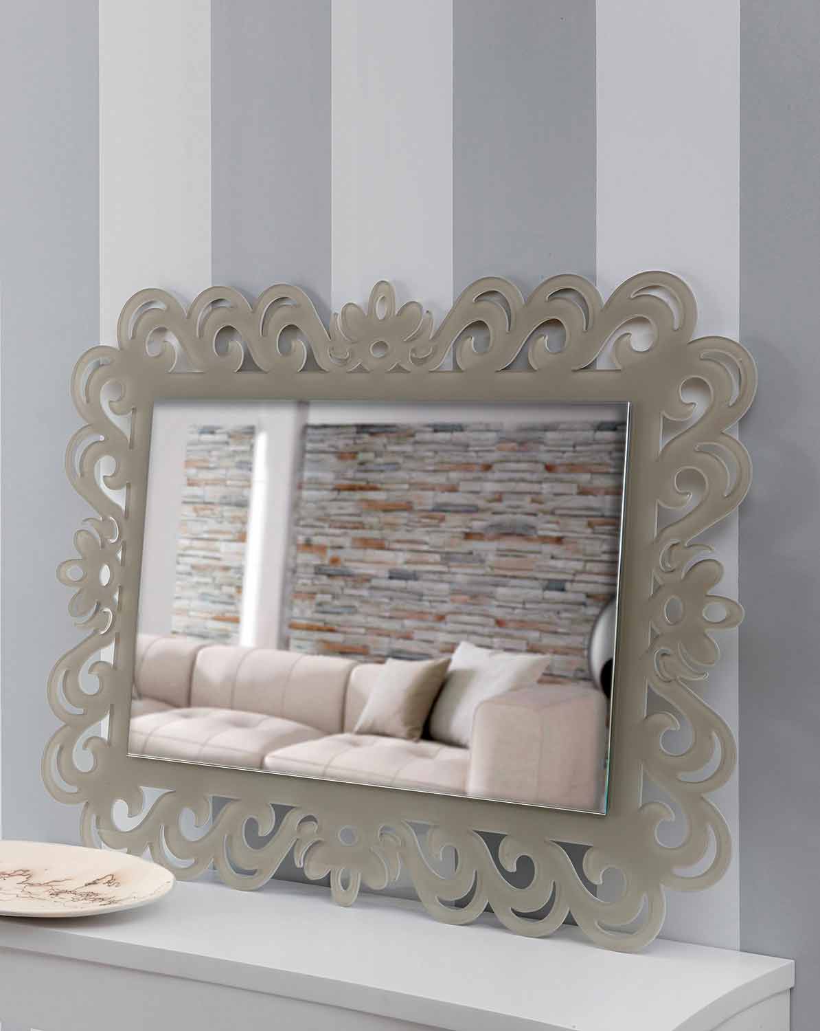 Prostokątne lustro ścienne z kwiatową ramą, z gołębiej szarej pleksi o nowoczesnym designie wykonanym we Włoszech.
