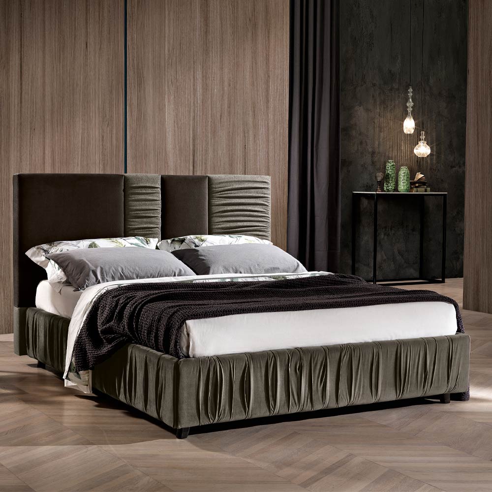Nowoczesne, wyściełane łóżko podwójne z pikowanym lub plisowanym zagłówkiem, wyprodukowane we Włoszech.