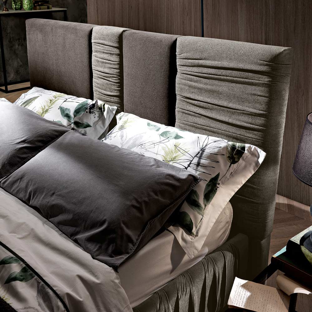 W tym podwójnym łóżku klasyczny prostokątny zagłówek dzieli się na cztery pionowe części o różnych rozmiarach, które na przemian łączą się z różnymi tkaninami, tworząc elegancką harmonię dotykową i wizualną.