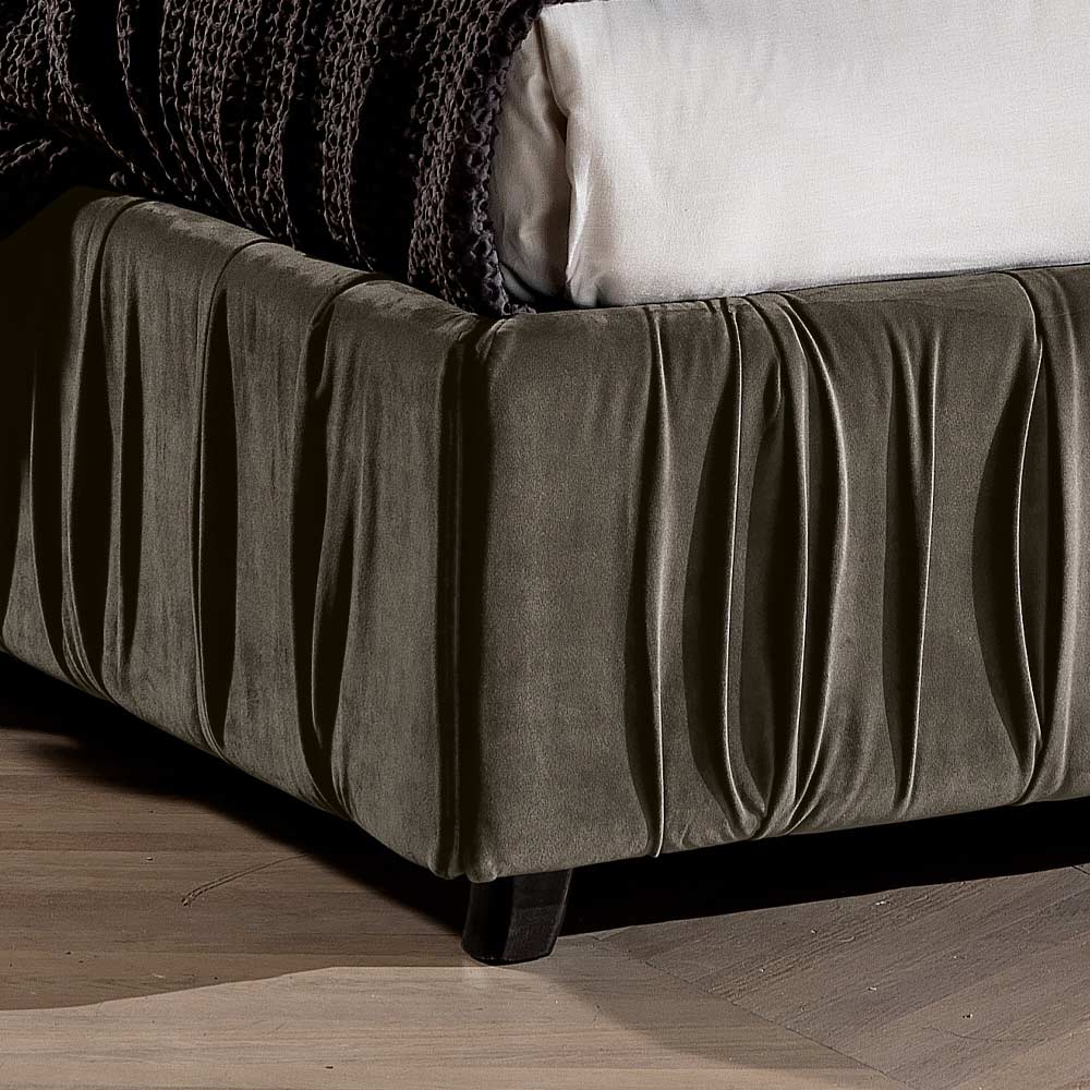 W wersji wulkanu i słonia nowoczesny dopełnienie wzornictwa ukazuje piękno tkaniny z zagięciami, które zastosowano również na ramie łóżka.