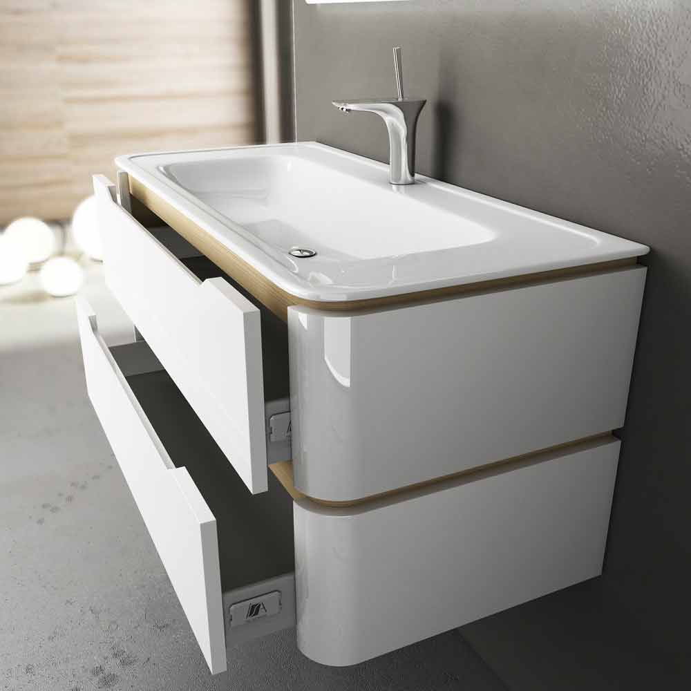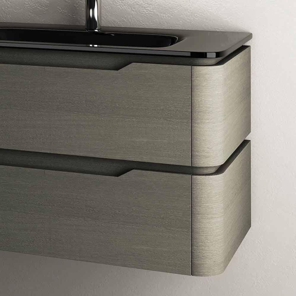 Arya to szafka łazienkowa ze zintegrowaną umywalką z 2 wyjmowanymi szufladami o zaokrąglonych bokach. Lakierowane drewno z wstawkami z naturalnego drewna. Niezwykle przezroczysty szklany blat ze zintegrowaną umywalką. Dostępne w różnych wykończeniach.