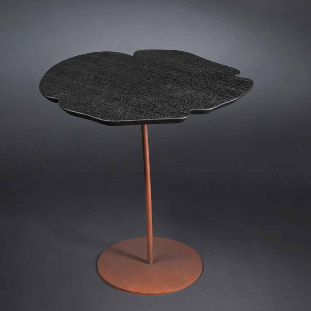 Stolik posiada blat wykonany z drzewa dębu szczotkowanego z otwrtymi porami w kolorze moka. Natomiast postawa metalowa lakierowana efektem Corten.