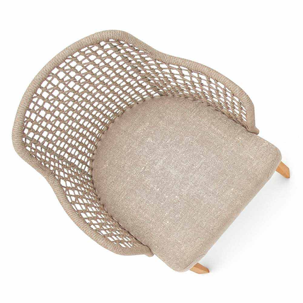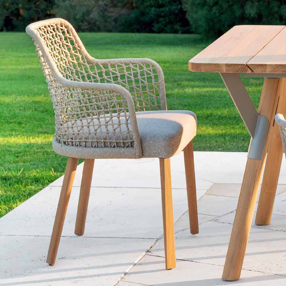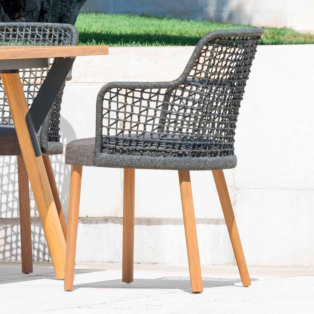 Emma to fotel ogrodowy charakteryzujący się ręcznie tkaną strukturą z włókien syntetycznych z beżową lub ciemnoszarą ramą aluminiową malowaną proszkowo.