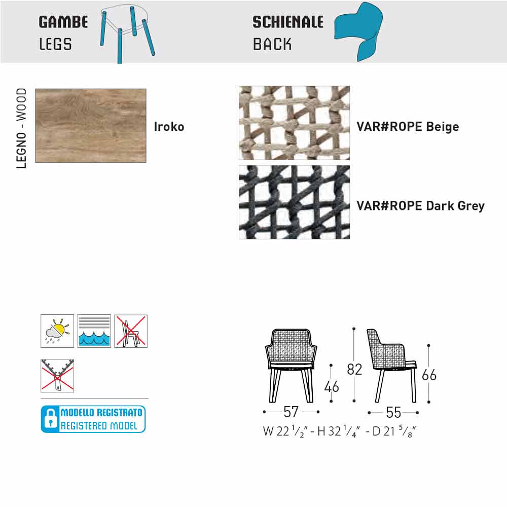 Jest również wyposażony w solidne nogi z drewna iroko i siedzisko tapicerowane tkaniną z polipropylenową strukturą siedziska.