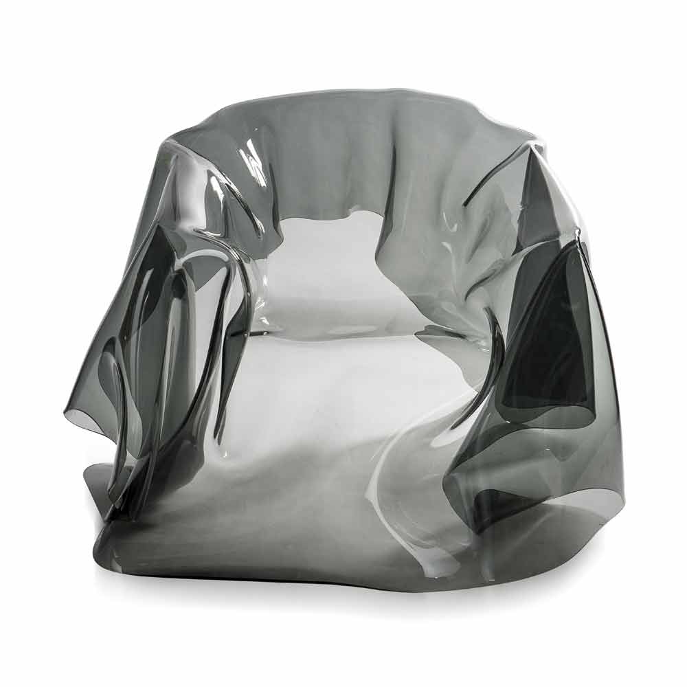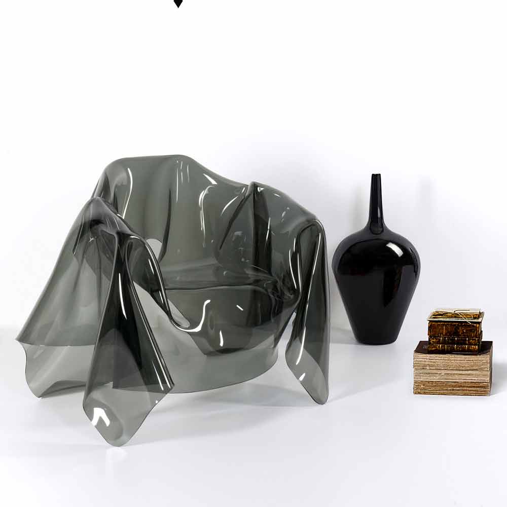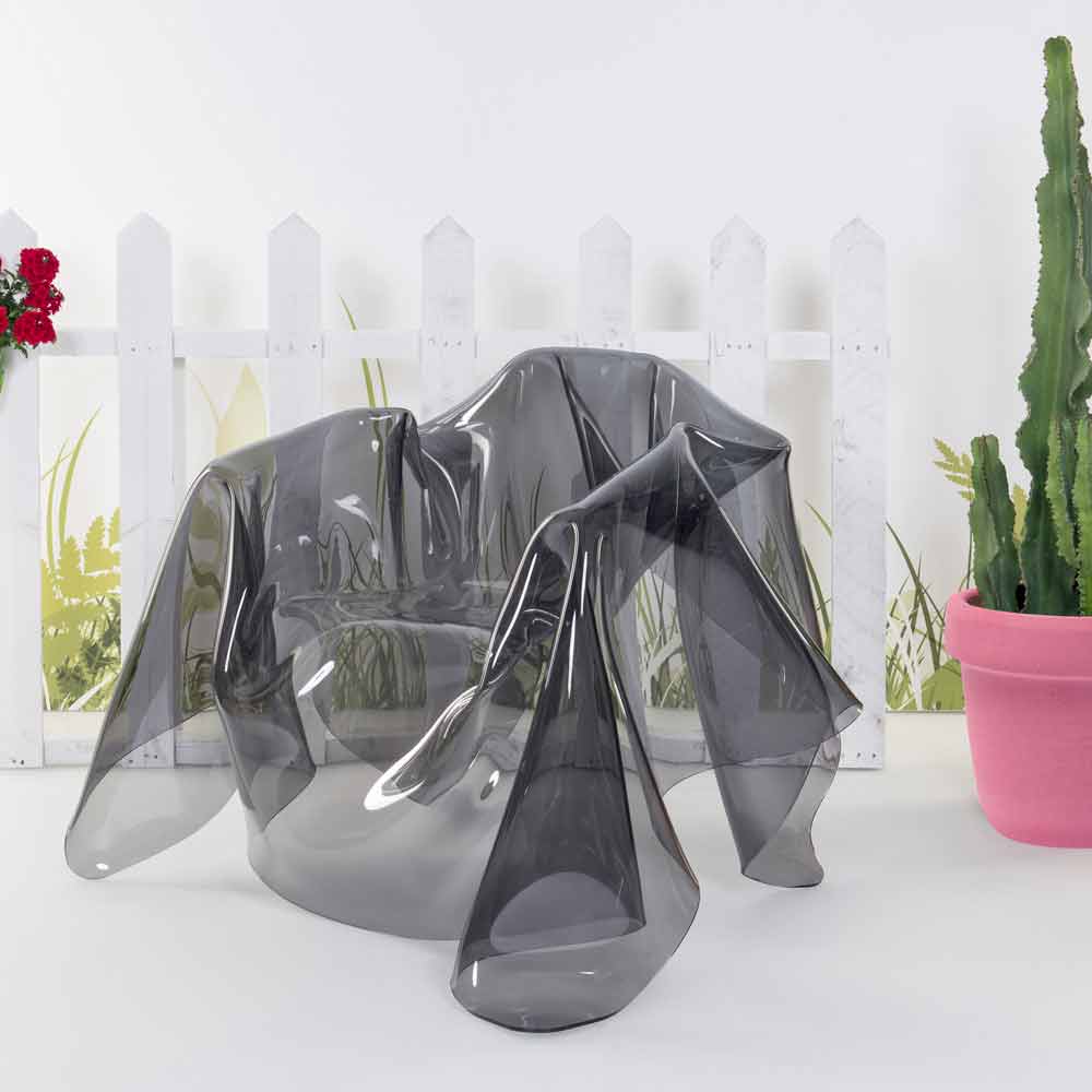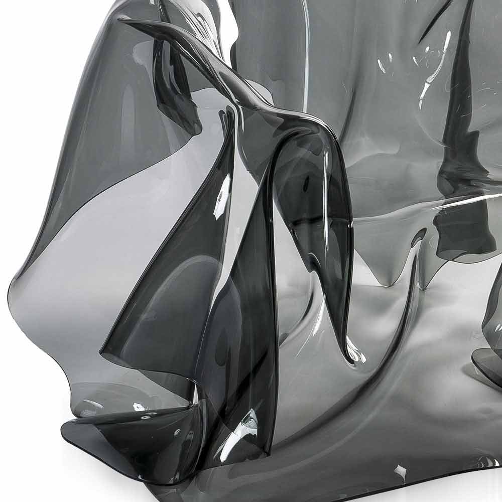 Fotel paryski z draperią to wyjątkowy przedmiot, dzieło sztuki współczesnej. Z płyty czystego 100% dziewiczego polimeru z pleksi PMMA o wędzonym kolorze, całkowicie ręcznie drapowanym, powstaje wyjątkowy i niepowtarzalny fotel. Fotel jest całkowicie samonośny i może pomieścić 1 osobę. Właściwości fizyczno-techniczne pleksi (odporne na wstrząsy, nieodkształcalne, niezmienne, termoizolacyjne) czynią ten artykuł praktycznym i funkcjonalnym meblem, odpowiednim dla każdego otoczenia. Jasność i jasność są utrzymywane na stałym poziomie i niezmienione w czasie. Pleksi PMMA z pierwotnego polimeru jest nietoksyczny, hipoalergiczny, bezwonny i antybakteryjny. 100% do recyklingu. Zaprojektowany, zaprojektowany i wyprodukowany we Włoszech z włoskimi materiałami.