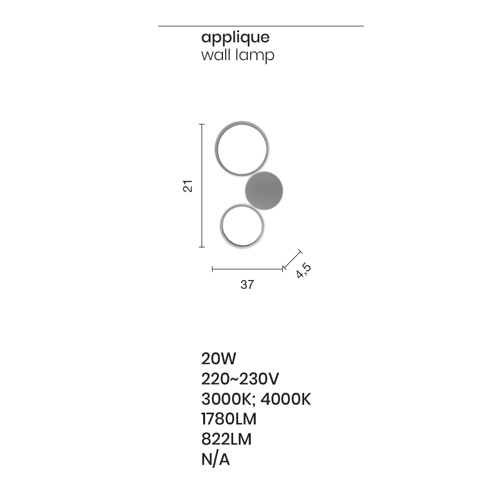 źródłem LED. Elegancja i oryginalność spotykają się w nowoczesnej kompozycji składającej się z trzech połączonych ze sobą okręgów o różnej wielkości i osłoniętych od zewnątrz mlecznobiałym dyfuzorem, który otacza pasek LED, tworząc wspaniałe efekty świetlne na ścianach