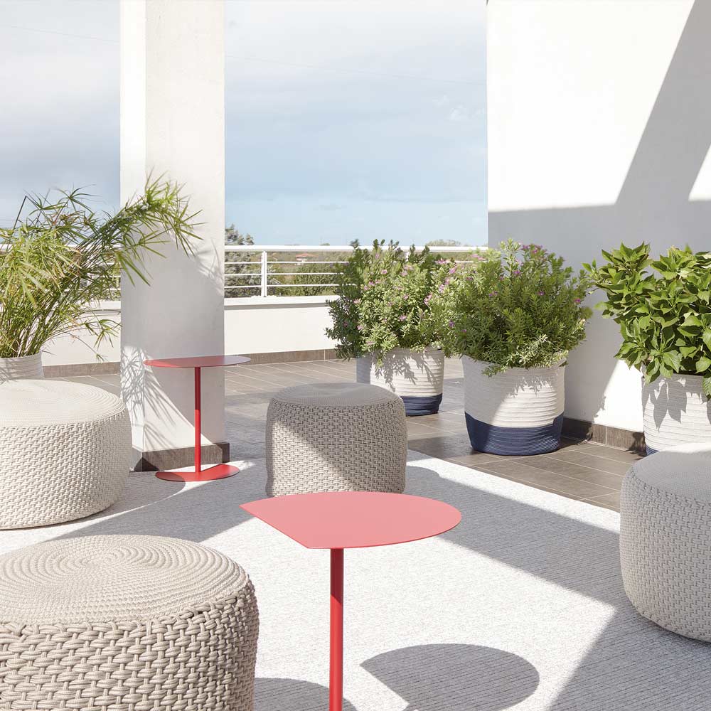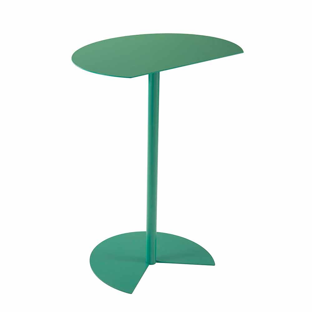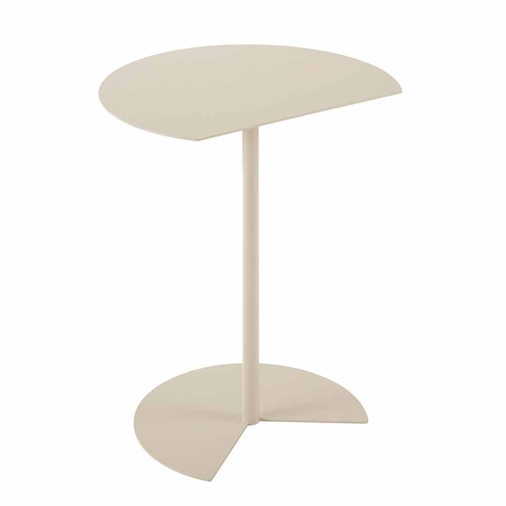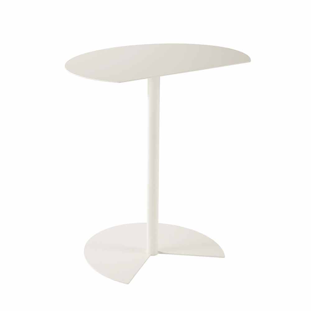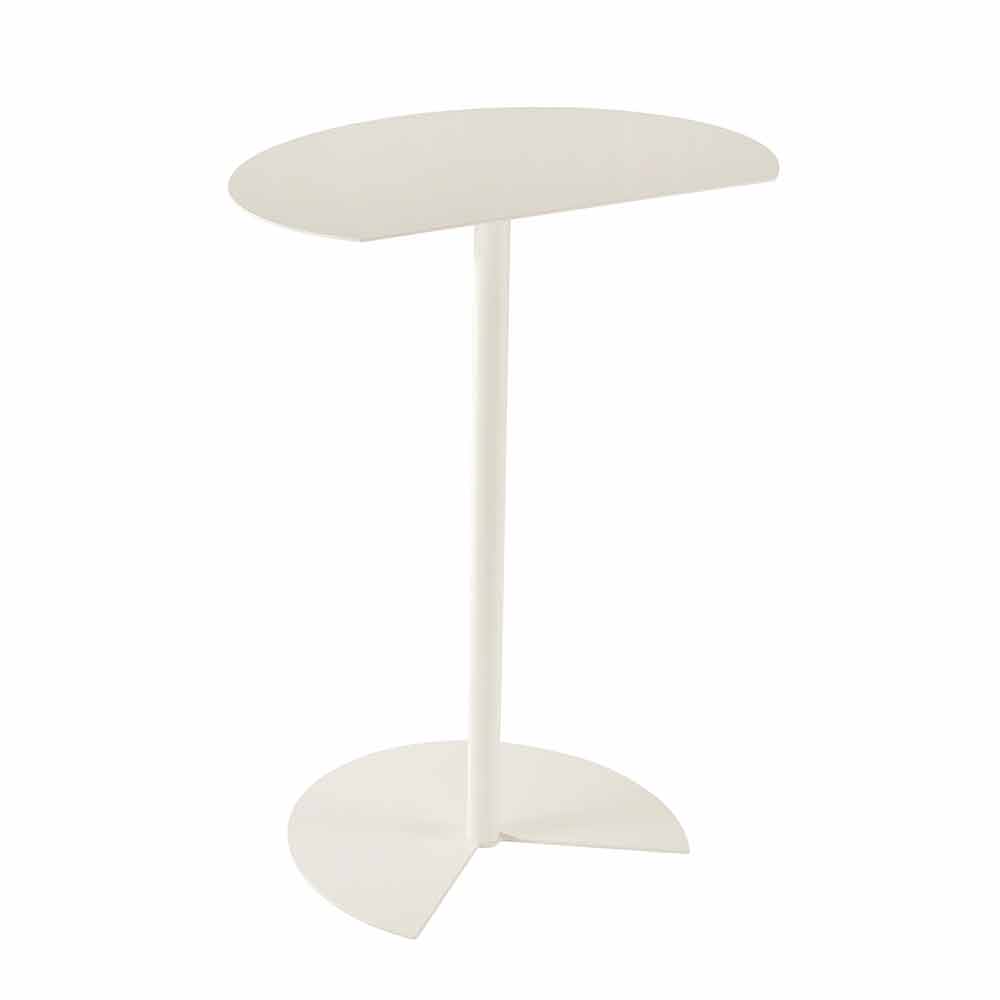 stolik kawowy do użytku na zewnątrz charakteryzuje się powierzchnią nośną, która przypomina okrągłość koła przełamanego czystym cięciem, dzięki czemu można go przymocować do ściany, aby zoptymalizować przestrzeń lub połączyć z podobnym, bardzo funkcjonalnym