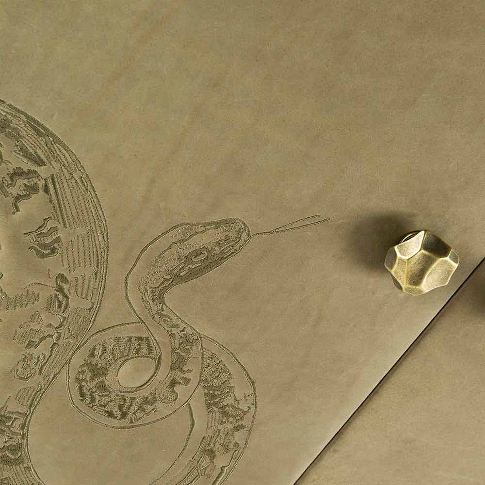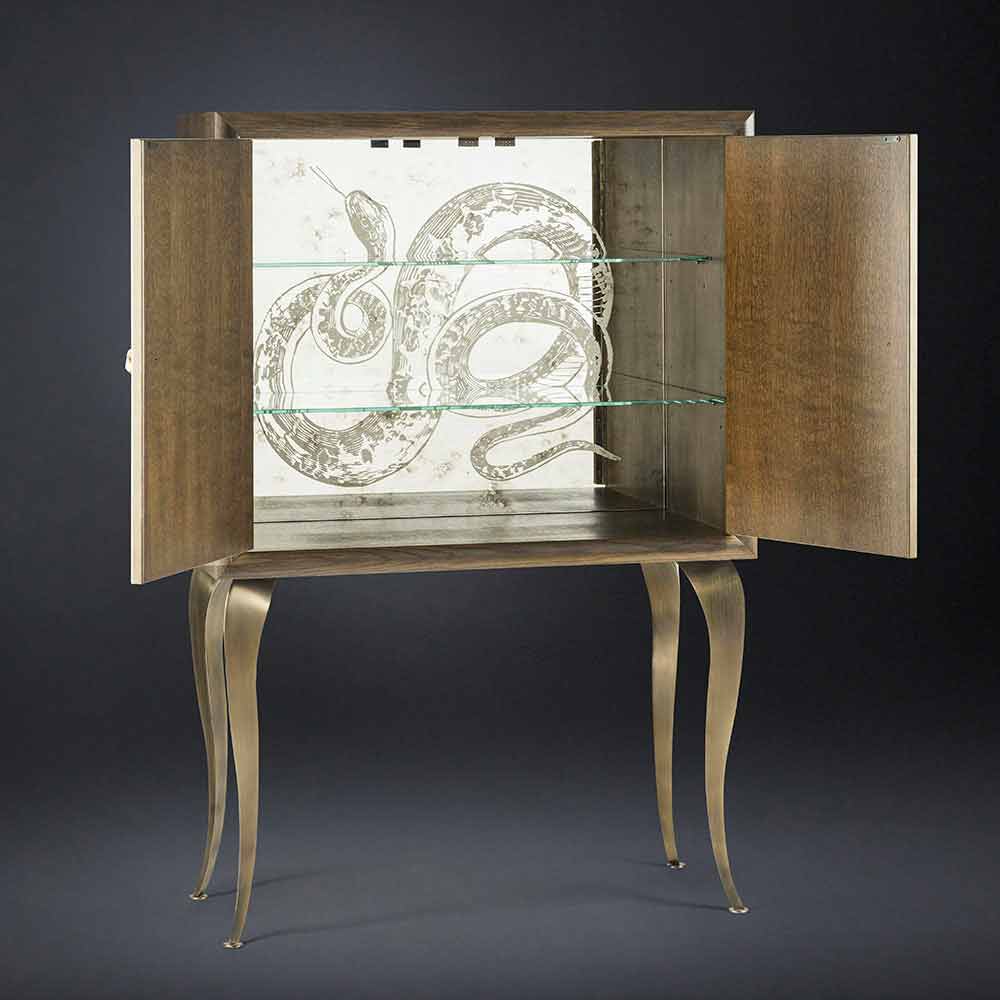 Radość jest wykonana z litego drewna dębowego z nogami z patynowanego mosiężnego metalu i regulowanymi stopami, a dwoje drzwi pokryte jest elitarną skórą anilinową. Wewnątrz znajdują się dwie szklane półki, a na plecach symbol haseł lub węża ogrodu Eden, również wyhaftowane na drzwiach szafki.