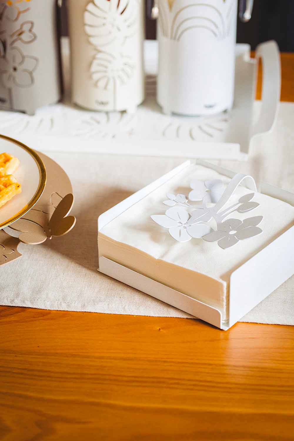 Stojak na serwetki o nowoczesnym designie, ręcznie wykonany we Włoszech w białym żelazie, marmurze, jasnoniebieskim lub błotnym.