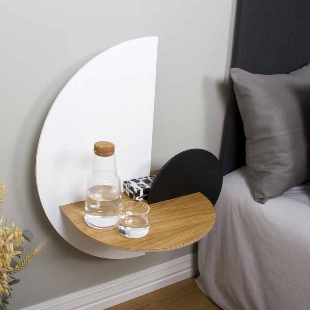 To, co charakteryzuje ten stolik nocny, to jego innowacyjny i oryginalny design, który może zrewolucjonizować wyposażenie każdej sypialni, która potrzebuje odrobiny osobowości i elegancji . Jego struktura ma proste geometryczne linie, które nadają produktowi wyjątkowości i harmonii między kształtami. Jego konstrukcję wykonano z 3 paneli ze sklejki, z których jeden w wykończeniu dębowym mocowany do ściany pełniący rolę rzeczywistej powierzchni nośnej oraz dwa w kolorze czarno-białym bejcowanym w kolorze jesionu, które są na nim zamontowane i pozwalają na 8 konfiguracje, dzięki czemu można uzyskać produkt, który można dostosować do własnych potrzeb.