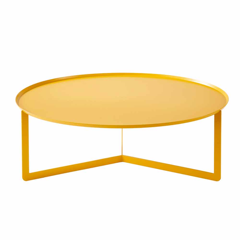 Okrągły nowoczesny stół ogrodowy, wykonany z błota lub żółtego metalu Majów, luksusowy wyprodukowany we Włoszech.