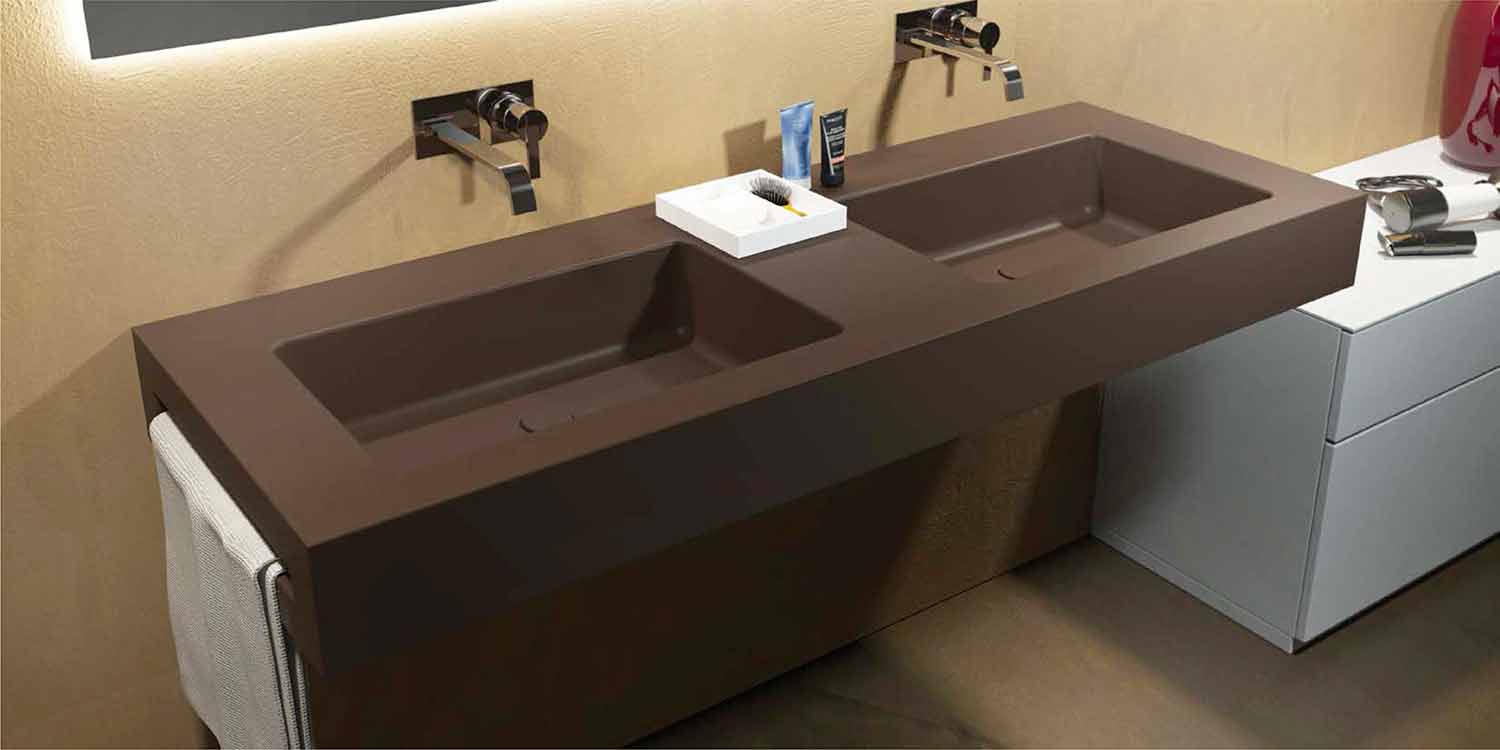 Ruffano doppio to zintegrowany system składający się z monolitycznego materiału wierzchniego, który integruje umywalki, może być instalowany na dowolnym typie podstawy lub pozostawiony w taki sposób, aby nadać łazience zasadniczy wygląd.