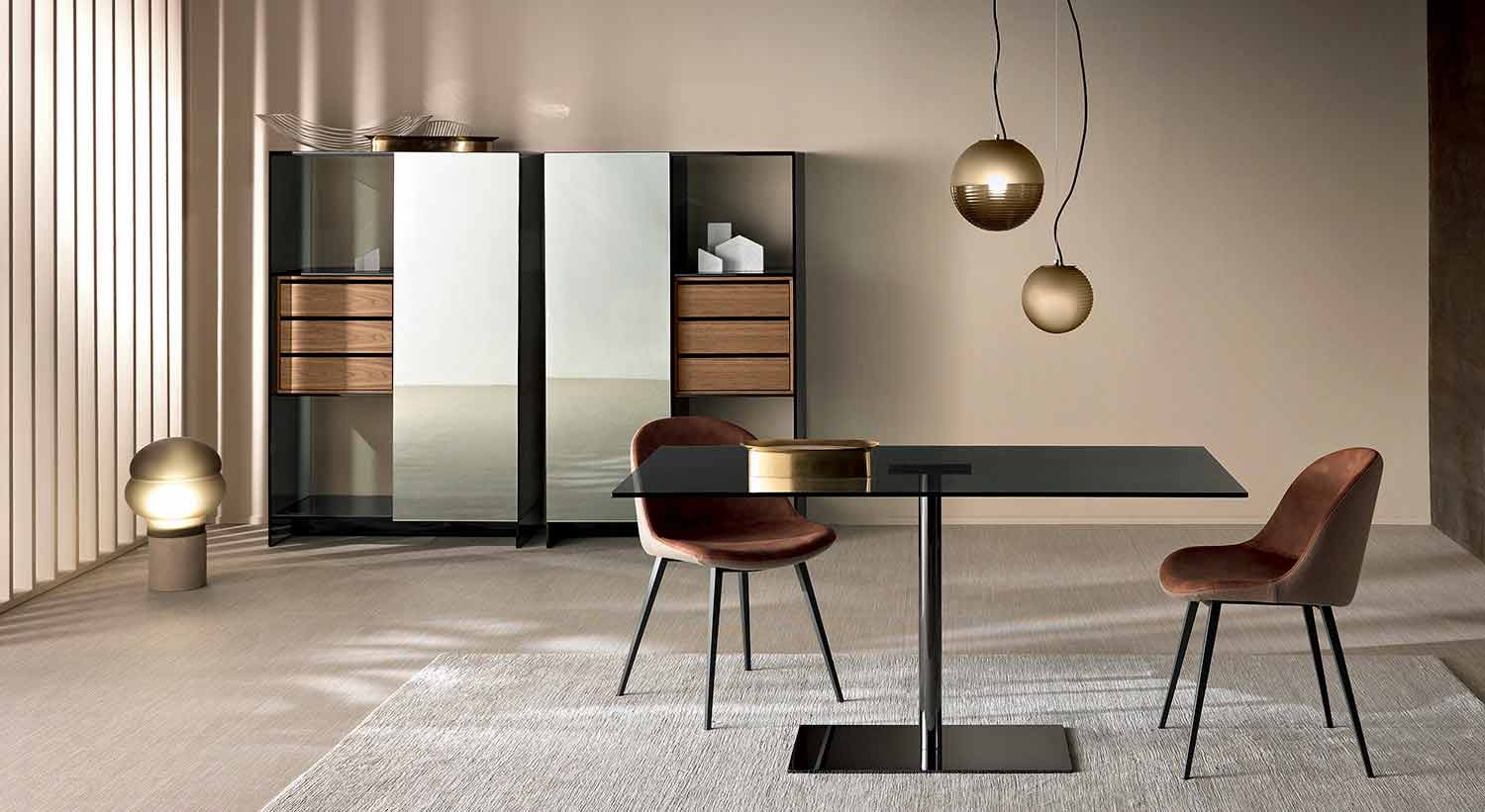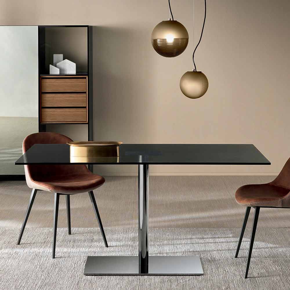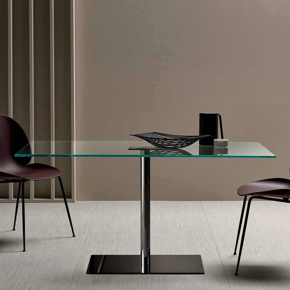 Luksusowy prostokątny stół z wyjątkowo przezroczystym lub wędzonym szklanym blatem i metalową podstawą, wyprodukowany we Włoszech.